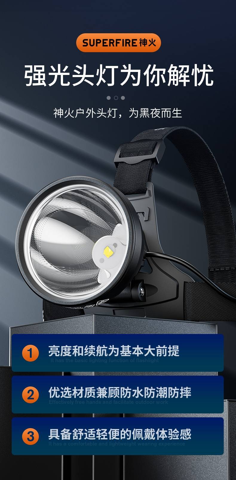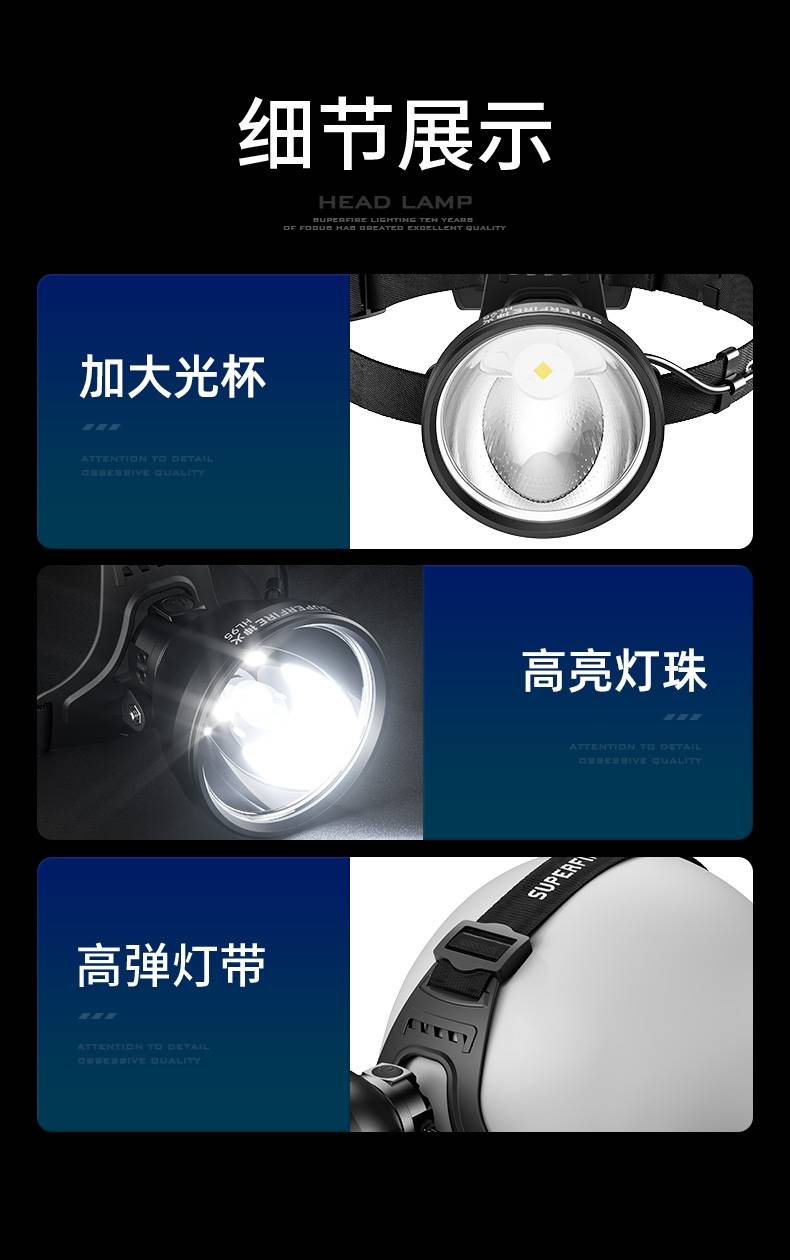 强光亮度,运动头灯,前后均衡设计,轻便不压头,可调节式头灯带,佩戴方便舒适,伸缩调焦,光照范围大,照射距离远,头灯角度调节,超90度角度随意调节,适宜各种环境使用