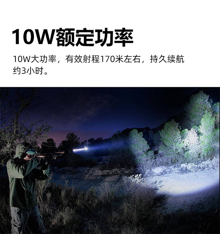 1、千米远射,射程更远,光斑更聚焦。 2、进口灯珠,亮度高,照明效果更好。 3、前后双按键,光源一键点亮,高亮瞬间开启。