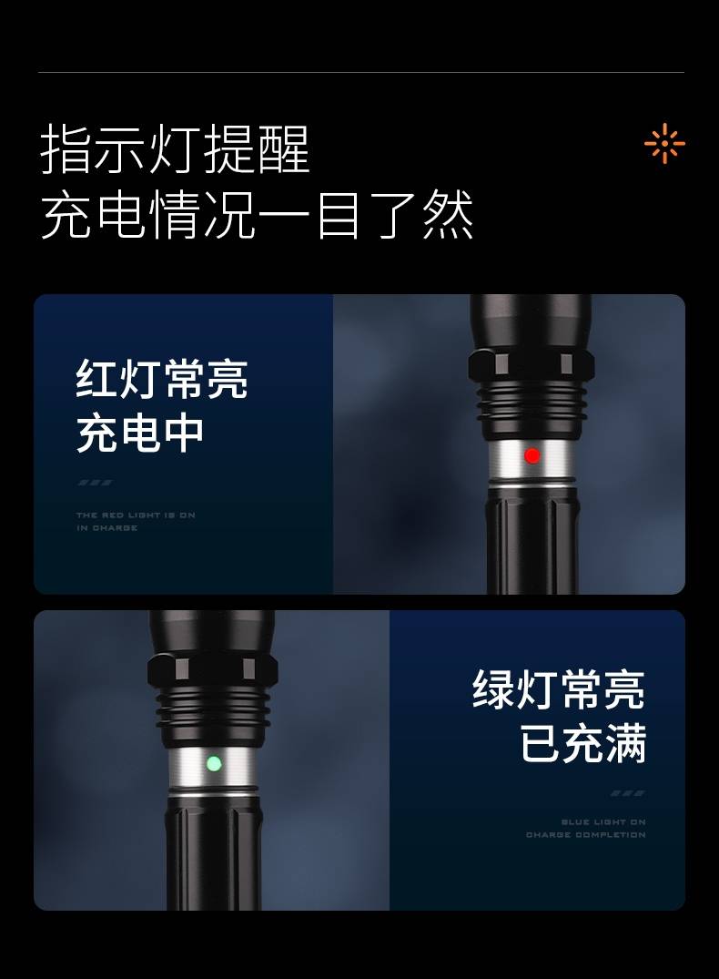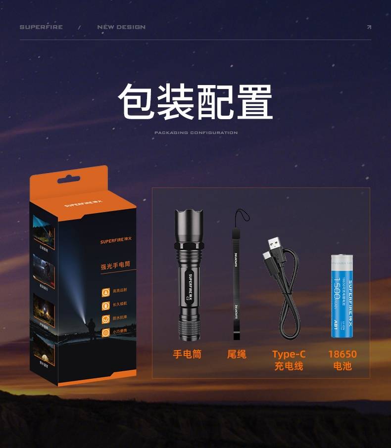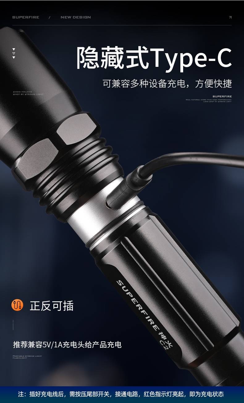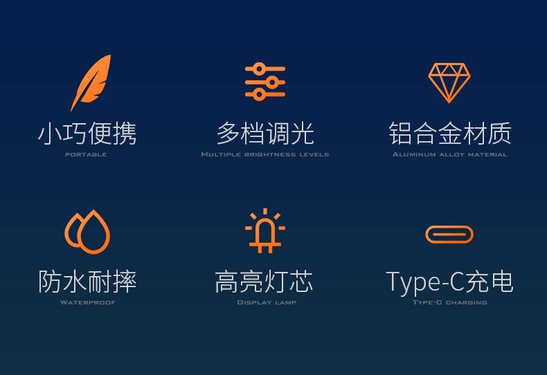 四档调光 Type-C充电 电量显示 铝合金筒身 持久续航 强力防水