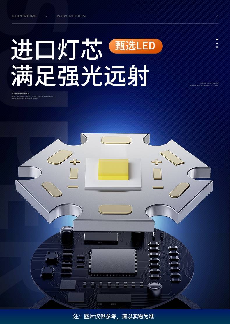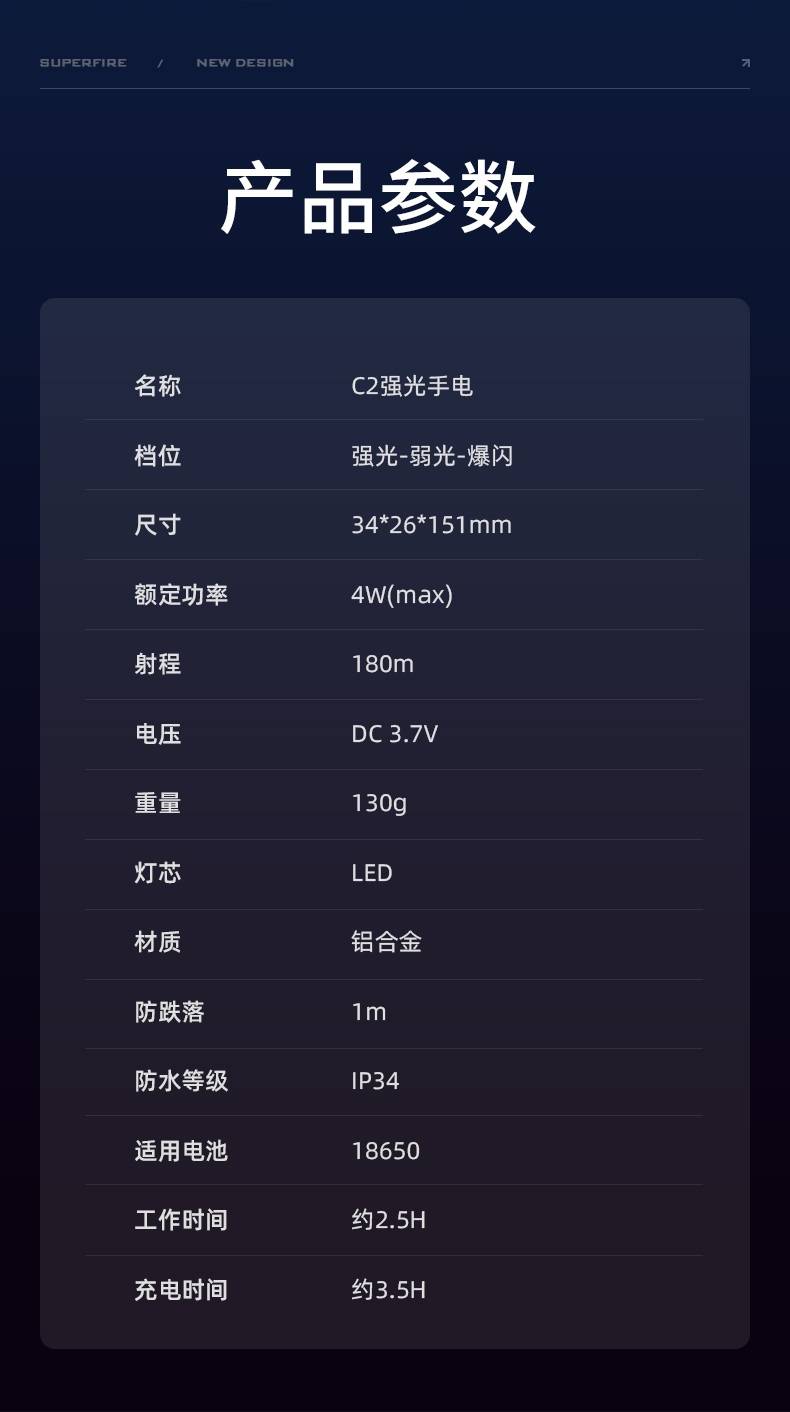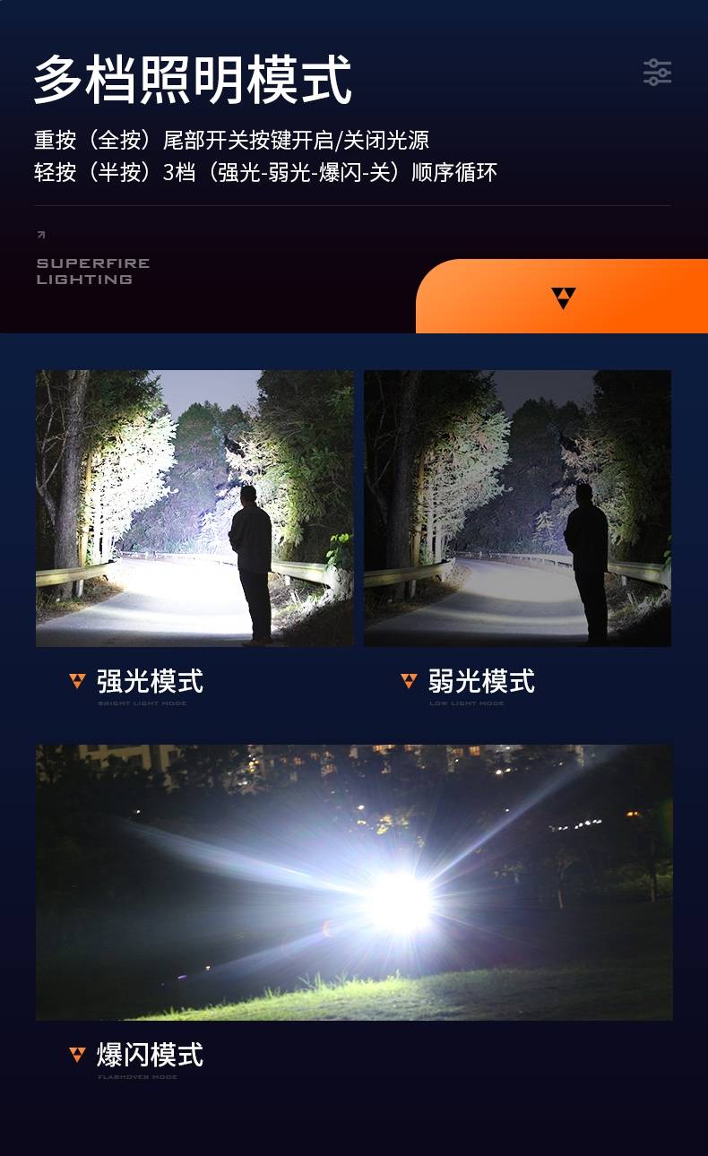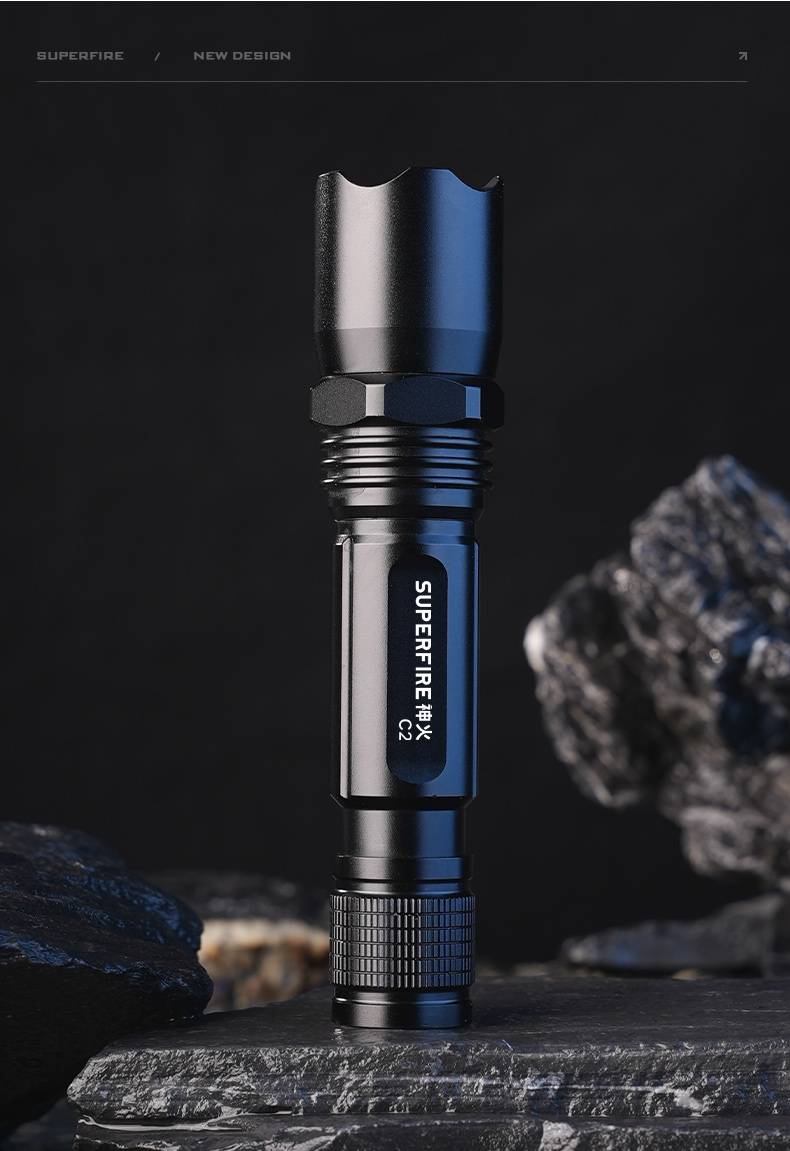 1、千米远射,射程更远,光斑更聚焦。 2、进口灯珠,亮度高,照明效果更好。 3、前后双按键,光源一键点亮,高亮瞬间开启。