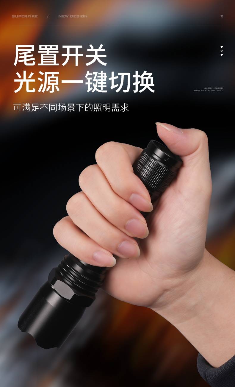 1、3档调光,可满足不同使用场景下的照明需求。 2、多种安全程序,可有效保护手电使用安全,延长手电使用寿命。 3、精致外观,时尚小巧。