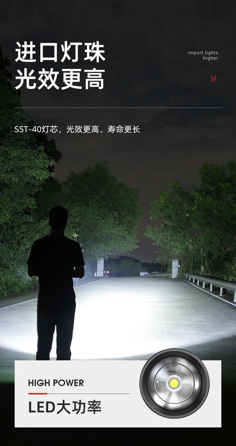 1、千米远射,射程更远,光斑更聚焦。 2、进口灯珠,亮度高,照明效果更好。 3、前后双按键,光源一键点亮,高亮瞬间开启。