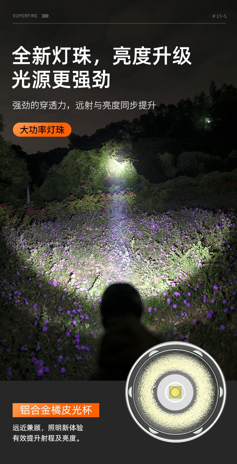 1、千米远射,射程更远,光斑更聚焦。 2、进口灯珠,亮度高,照明效果更好。 3、前后双按键,光源一键点亮,高亮瞬间开启。