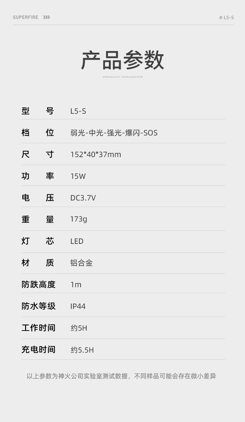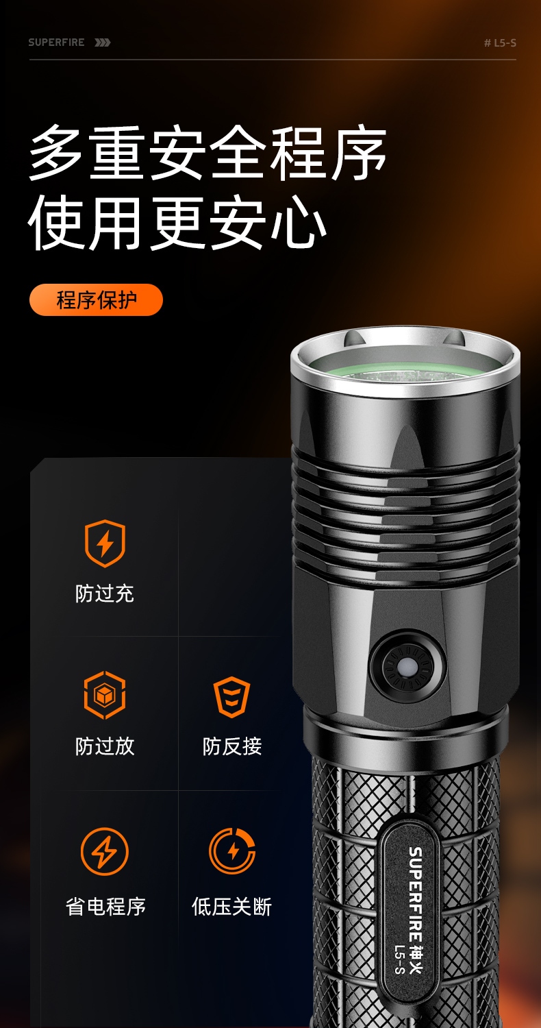 P50灯芯,亮度更高,射程更远。低电量提醒,使用更安心。大容量26650电池,续航更持久 ,充电指示灯设计,充电状态一目了然
