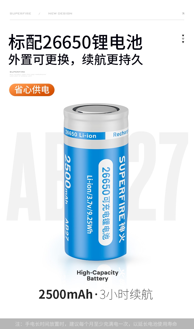 7、外置26650电池,亏电状态下,可随时换电池,延长使用时间。