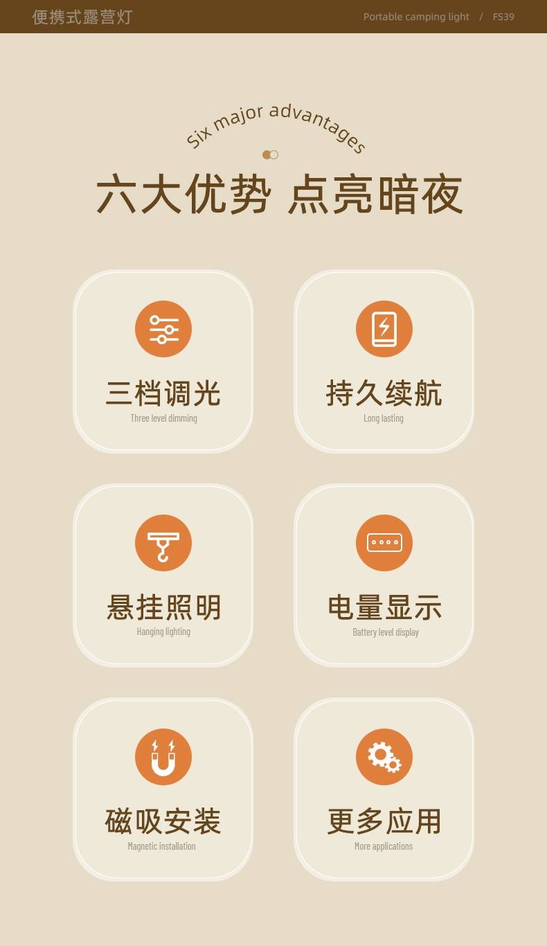 六大优势 点亮暗夜 三档调光 持久续航 磁吸安装 电量显示 悬挂照明