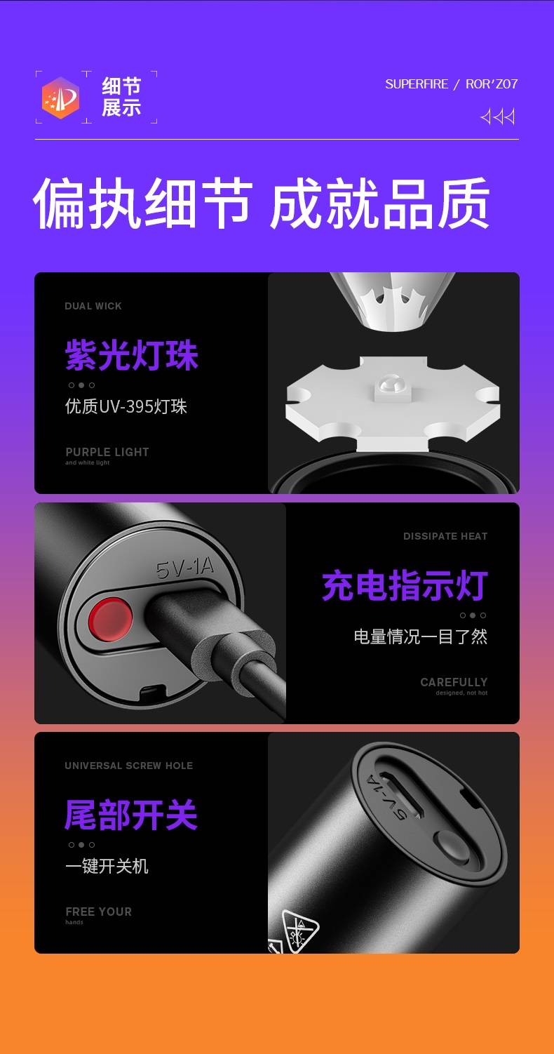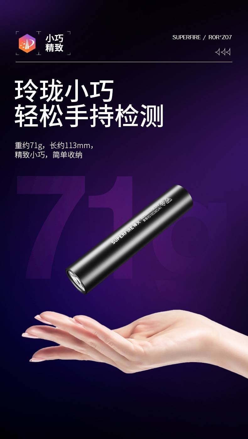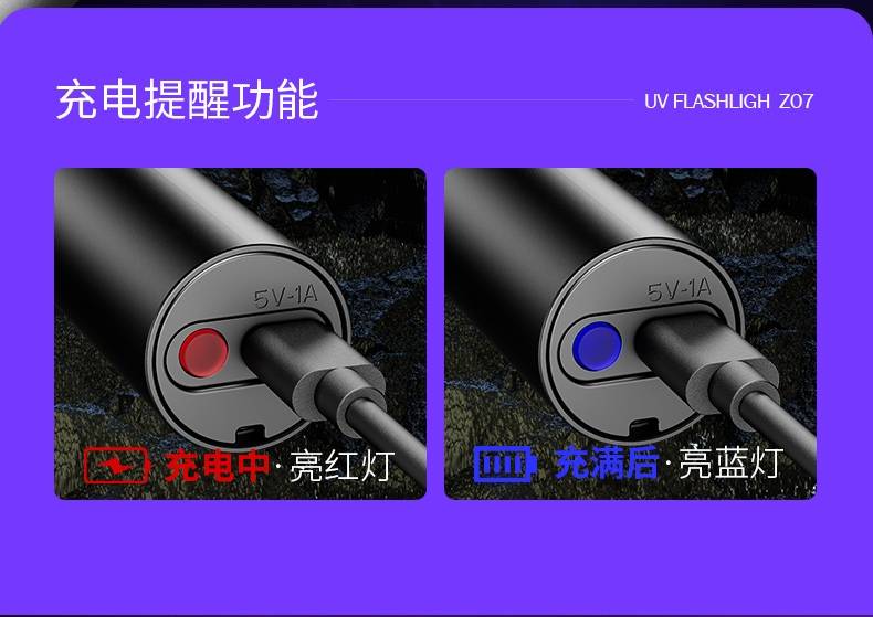 1、紫光手电:可用于验钞、识别荧光剂,宠物荧光检测,鉴别琥珀、蜜蜡,古玩修补鉴定。 2、单档开关,操作便捷。