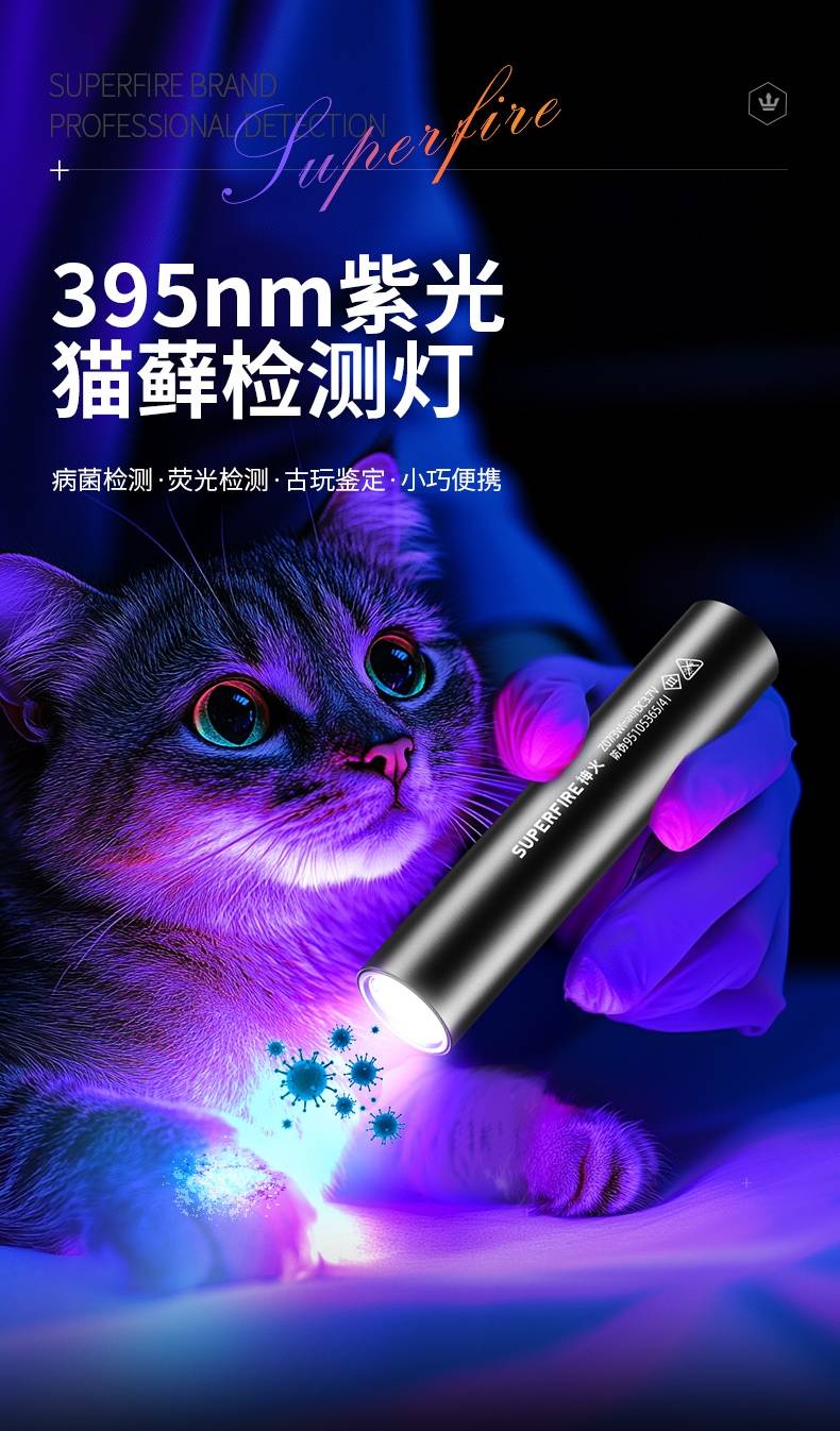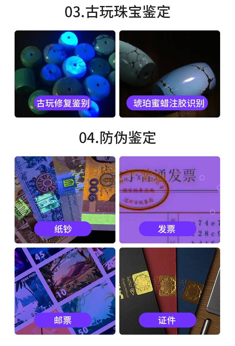 1、紫光手电:可用于验钞、识别荧光剂,宠物荧光检测,鉴别琥珀、蜜蜡,古玩修补鉴定。