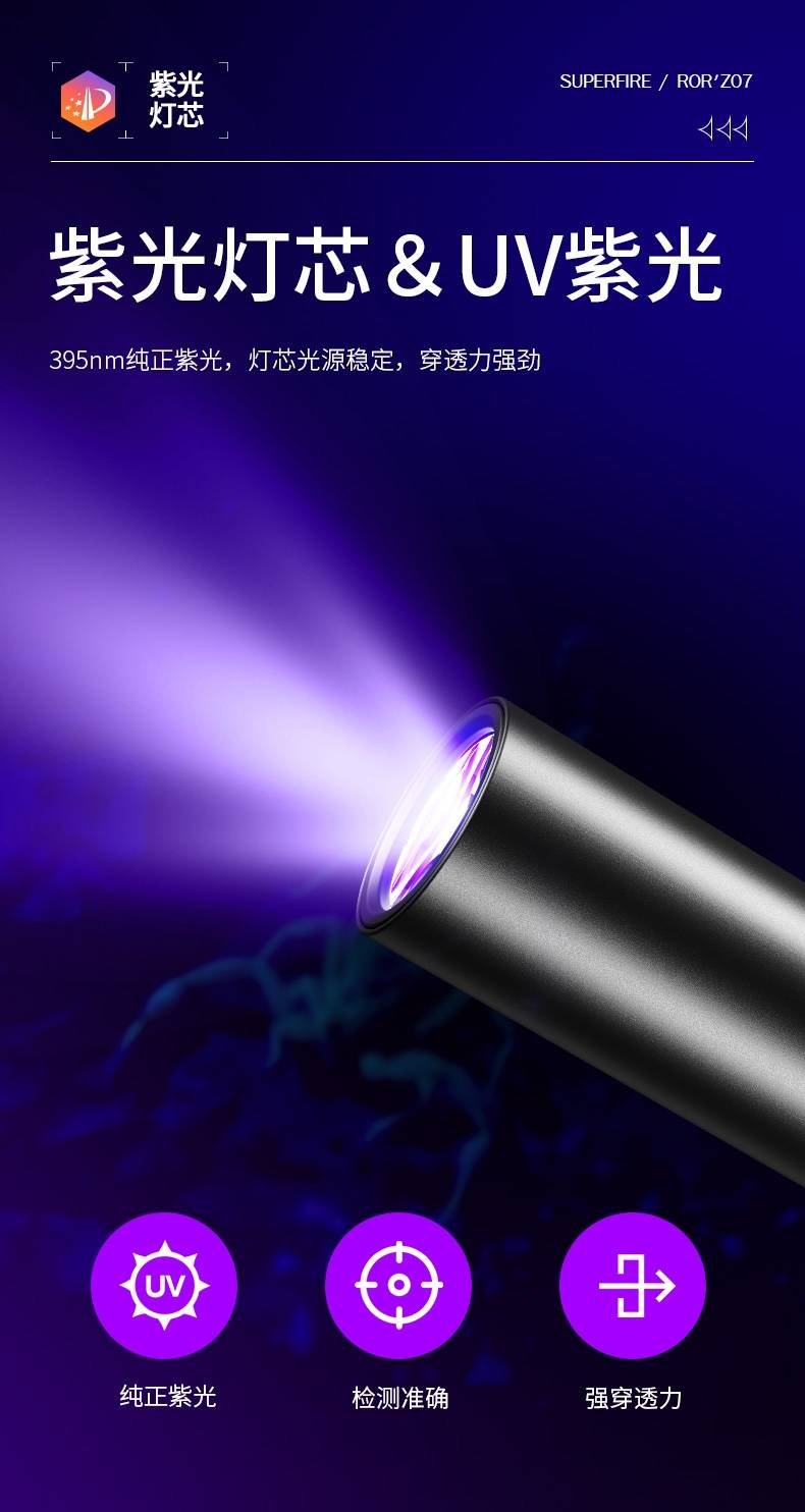 6、纯净紫光:395nm紫光,多功能,可检测荧光、病菌、防伪。