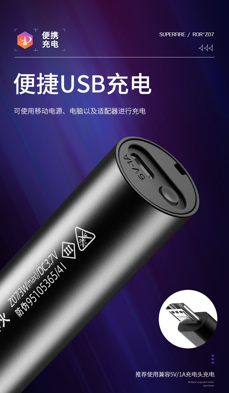 3、多样化充电,使用方便:设有Micro-USB充电接口,可使用充电器、充电宝、电脑等设备为手电充电。