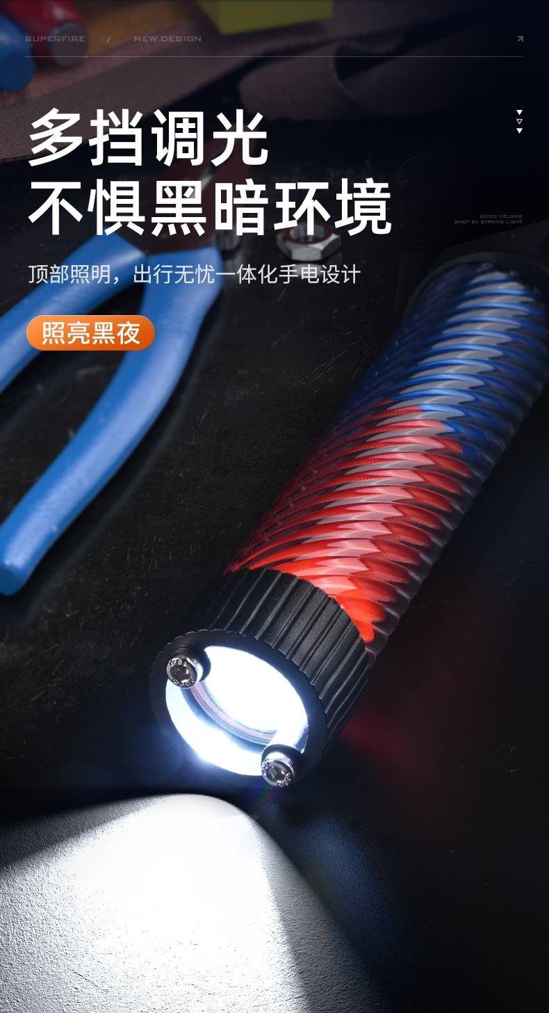 2,按压灯光键,挡位依次:红蓝慢闪-红蓝快闪-红蓝长亮-手电强光-手电爆闪-关闭;