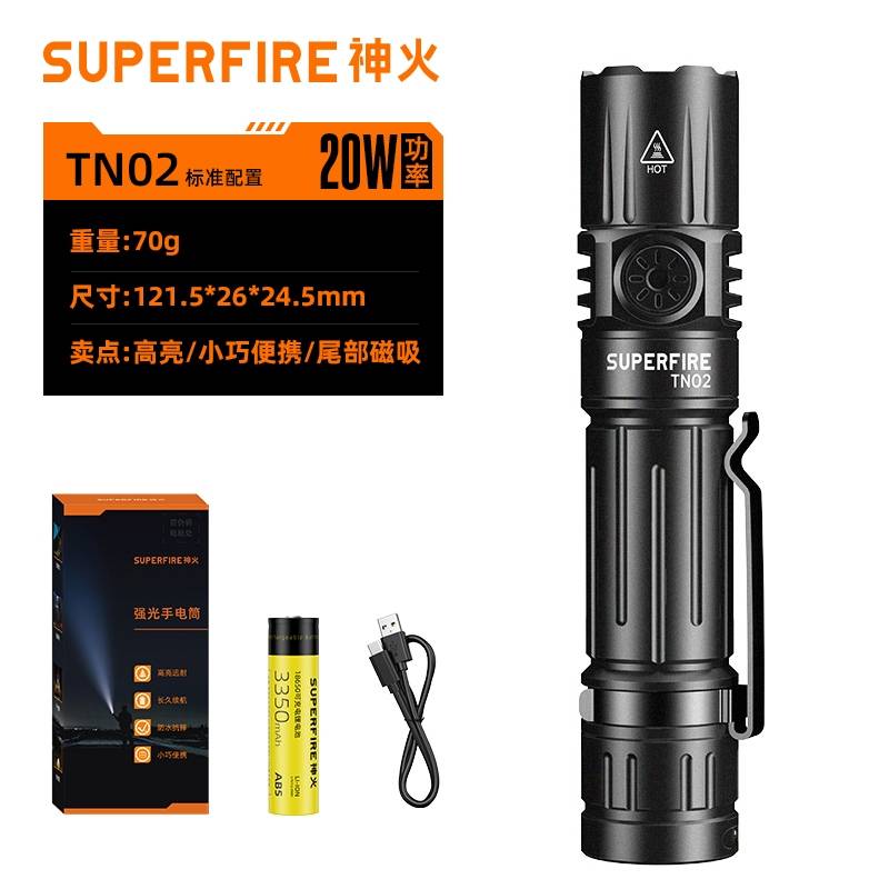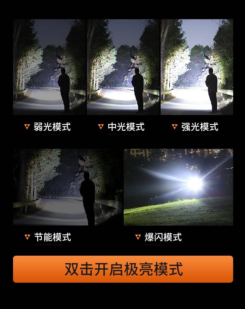 1、千米远射,射程更远,光斑更聚焦。 2、进口灯珠,亮度高,照明效果更好。 3、前后双按键,光源一键点亮,高亮瞬间开启。