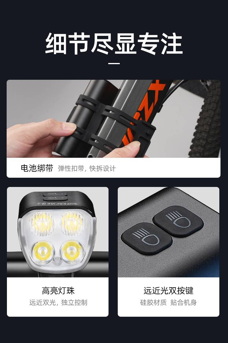 车灯设有远光和近光前后两个按钮,操作如下: 单击前按钮开启远光,挡位依次为:远强光-远中光-远弱光-快闪-SOS-关闭 单击后按钮开启近光,挡位依次为:近强光-近中光-近弱光-快闪-SOS-关闭 前后按钮任意双击开启远近光,挡位依次为:: 远近强光-远近中光-
