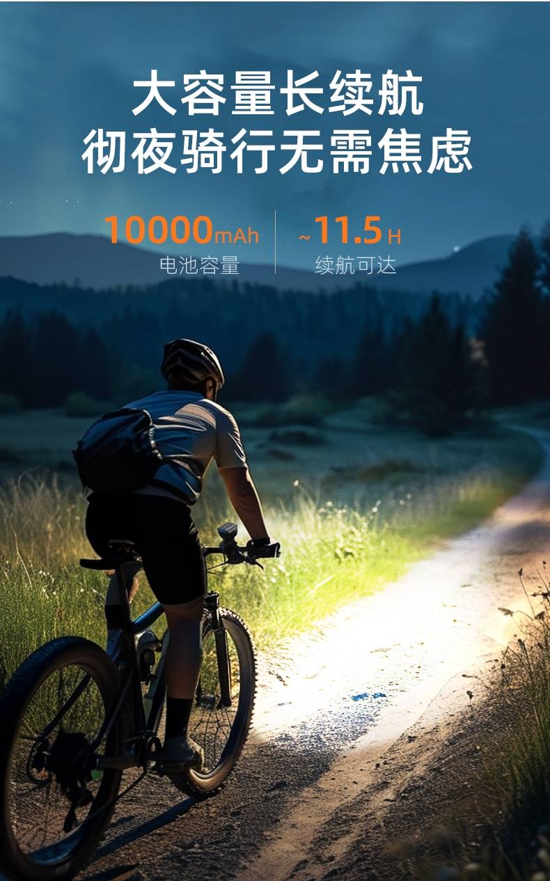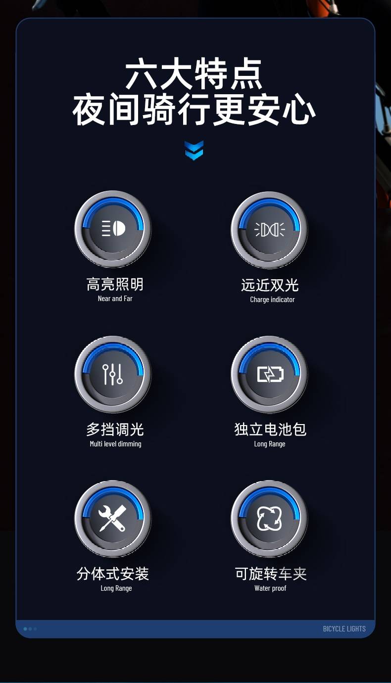 分体式安装大大减轻车头负重;独立电池包,充电无需拆车灯;高亮度1800LM,远近双光(可独立控制),大容量,车头可旋转。