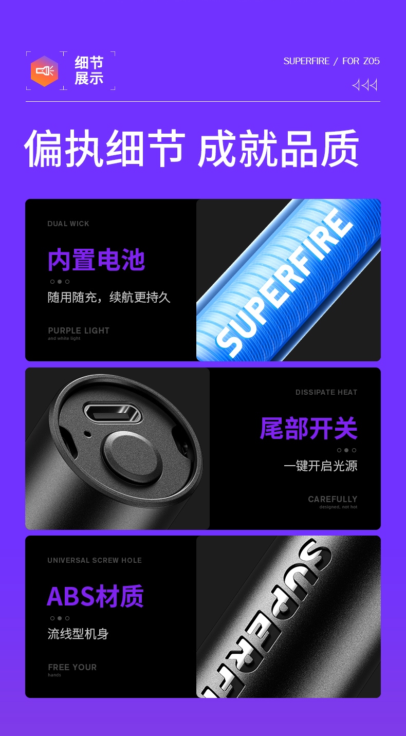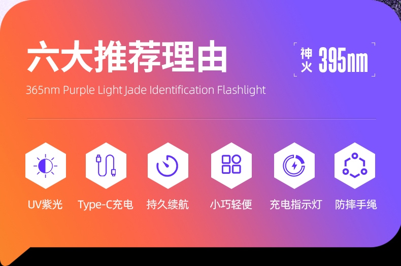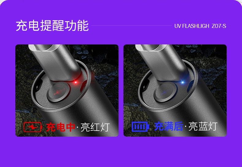 1、紫光手电:可用于验钞、识别荧光剂,宠物荧光检测,鉴别琥珀、蜜蜡,古玩修补鉴定。 2、单档开关,操作便捷。 3、多样化充电,使用方便:设有Type-C充电接口,可使用充电器、充电宝、电脑等设备为手电充电。