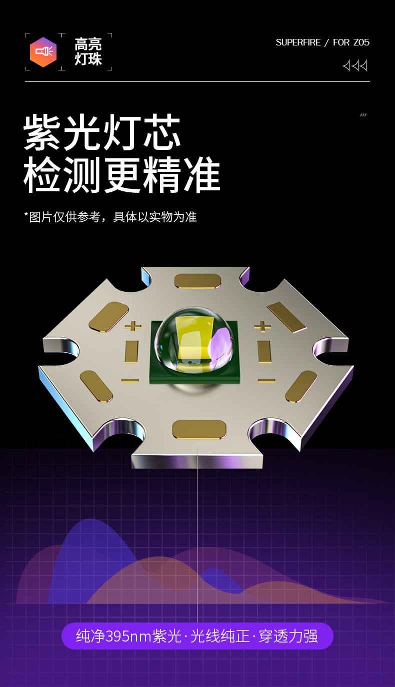 6、纯净紫光:395nm紫光,多功能,可检测荧光、病菌、防伪等。
