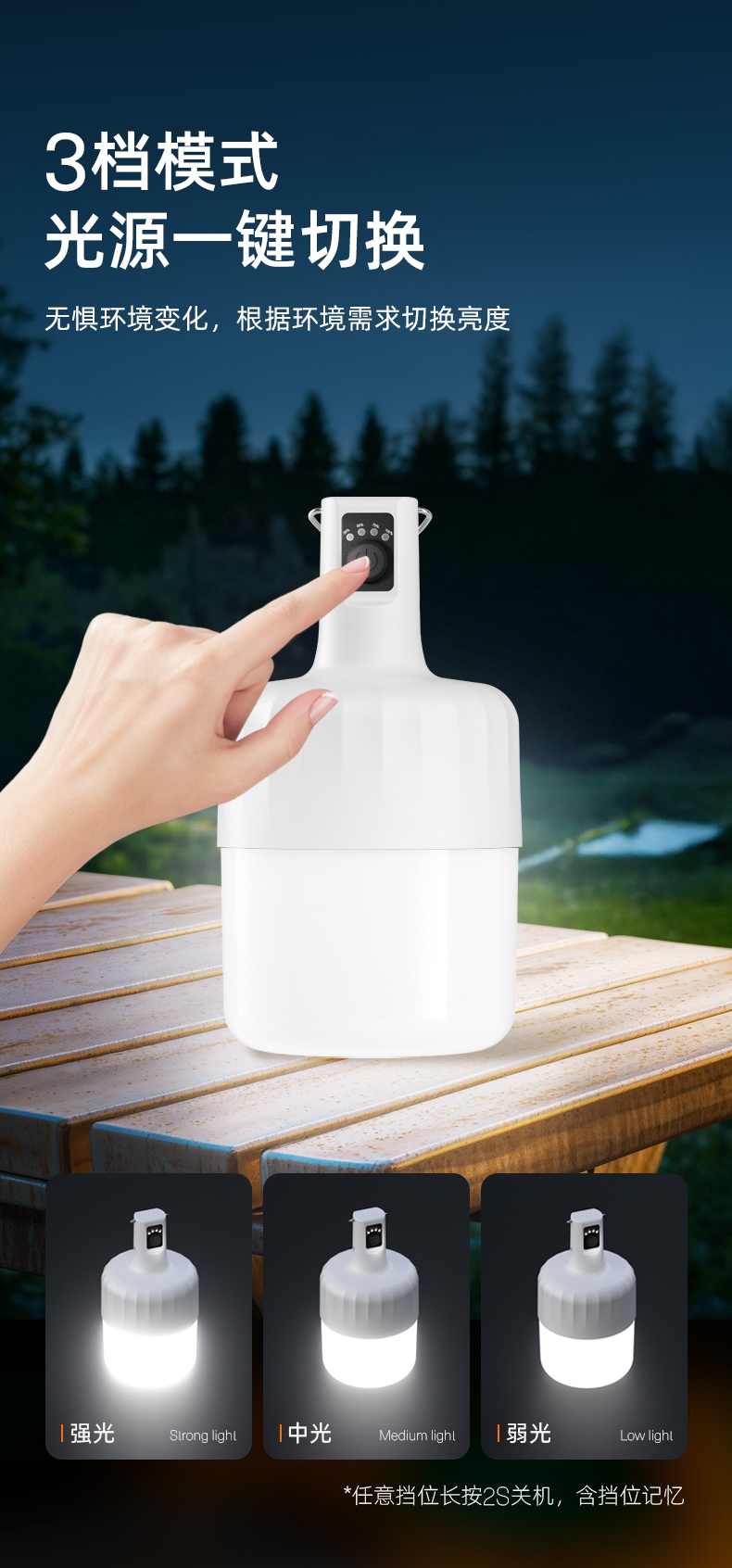 1.按压灯头开关按钮开启即强光档,续按调档。3个档位,以强光-中光-弱光-关依次循环,任意档位长按2S关机,含档位记忆。