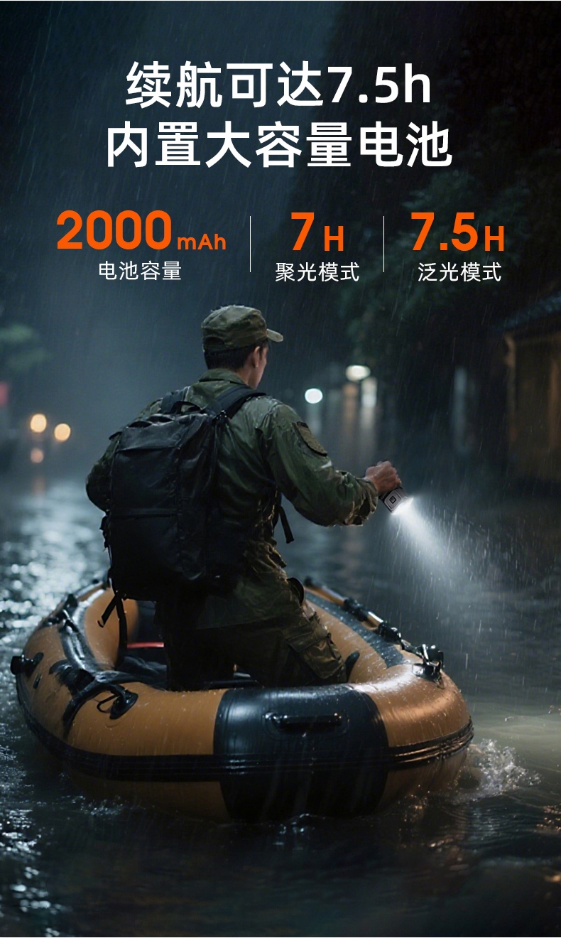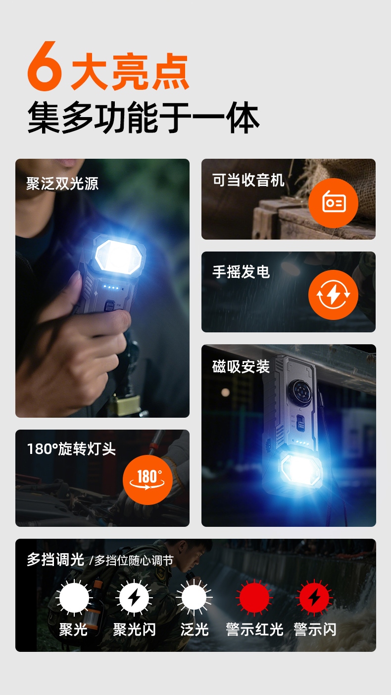 短按开关键,依次亮灯为:聚光→聚光闪→ 泛光→ 警示红光→警示闪→关闭。