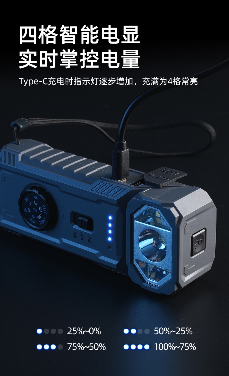 3、灯具设有4格电量指示灯,分别代表电量25%、50%、75%、100%;