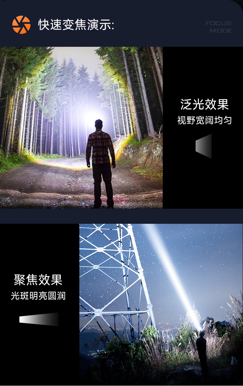 1.五档一体:强中弱、爆闪、SOS自由切换,可满足不同场景下的使用需求。 2.铝合金筒身,防水耐摔。 3.伸缩调焦,远近一体。