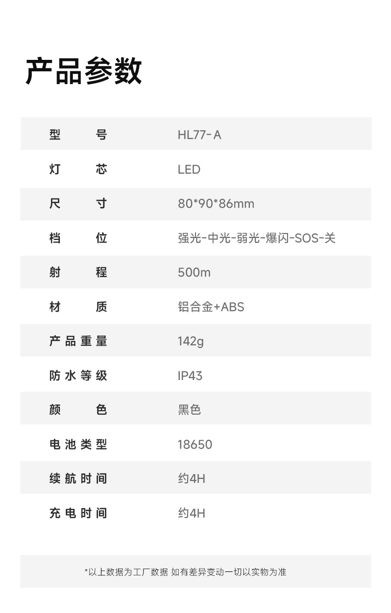 聚光主灯 亮度随心 轻按后端开关按钮,主灯强光点亮,续按依次切换主灯工作光-爆闪光。主灯开启状态下长按5秒,可实现光源色温转换。主灯关闭状态下长按5秒,可开启灯具最亮照明模式。 爆亮强光 亮如白昼 1500LM大功率高亮光源,点亮顷刻如白昼