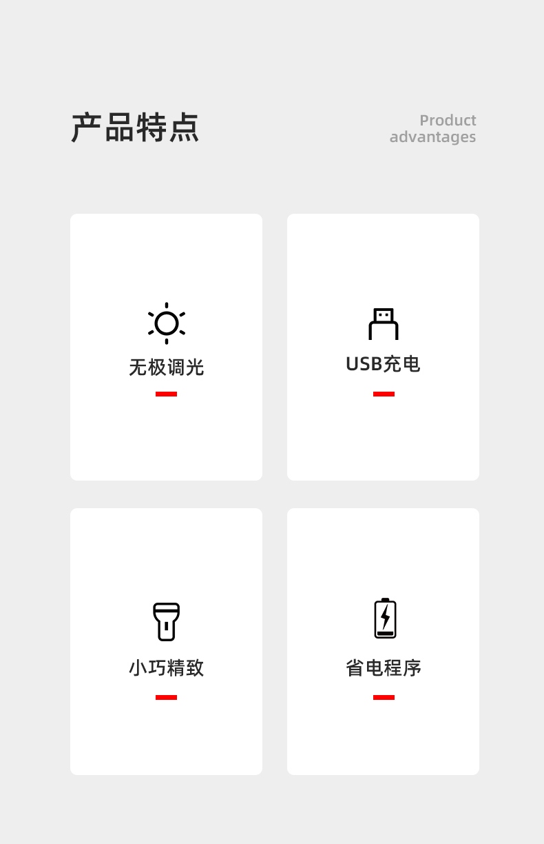 无极调光,满足生活所需,多样化充电,使用方便:设有type-C充电接口,可使用充电器、充电宝、电脑等设备为手电充电。设有省电程序:更亮更持久。小巧精致:外出携带更方便。