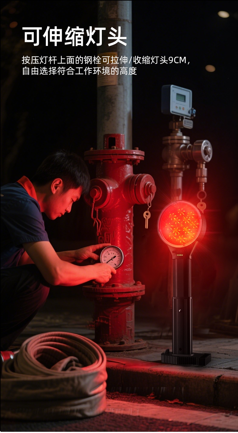 2、灯头可伸缩,按压灯杆上面的钢栓可拉伸/收缩灯头9CM;