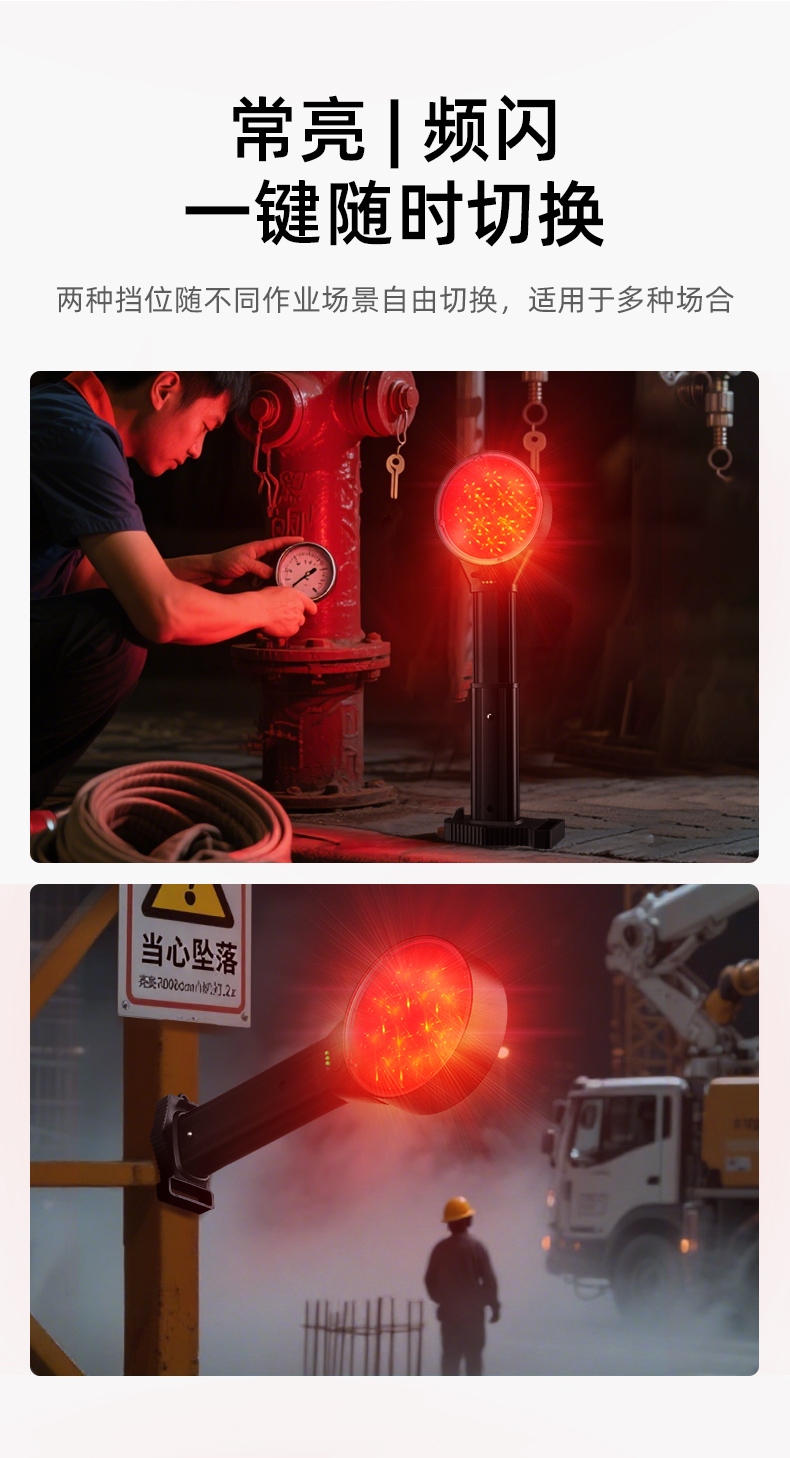 正反两面发光,单向可视距离达1500米,灯头可伸缩9CM,雨雾穿透力强,两挡灯光,钢化玻璃镜片,可磁吸安装,可挂装
