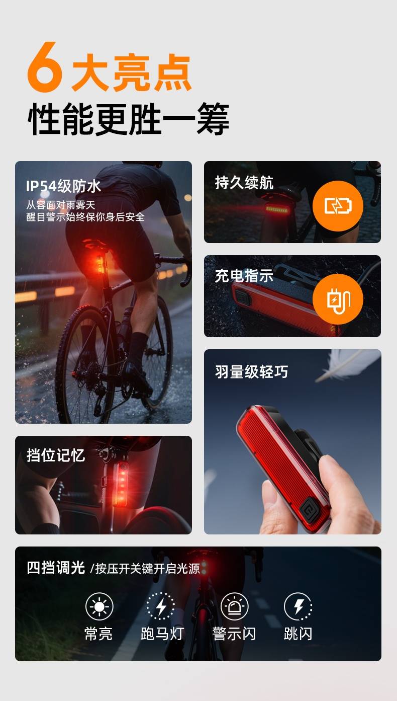 6、IP54优质防水,雨雾天骑行依旧光亮,充分保障雨季骑行需求;