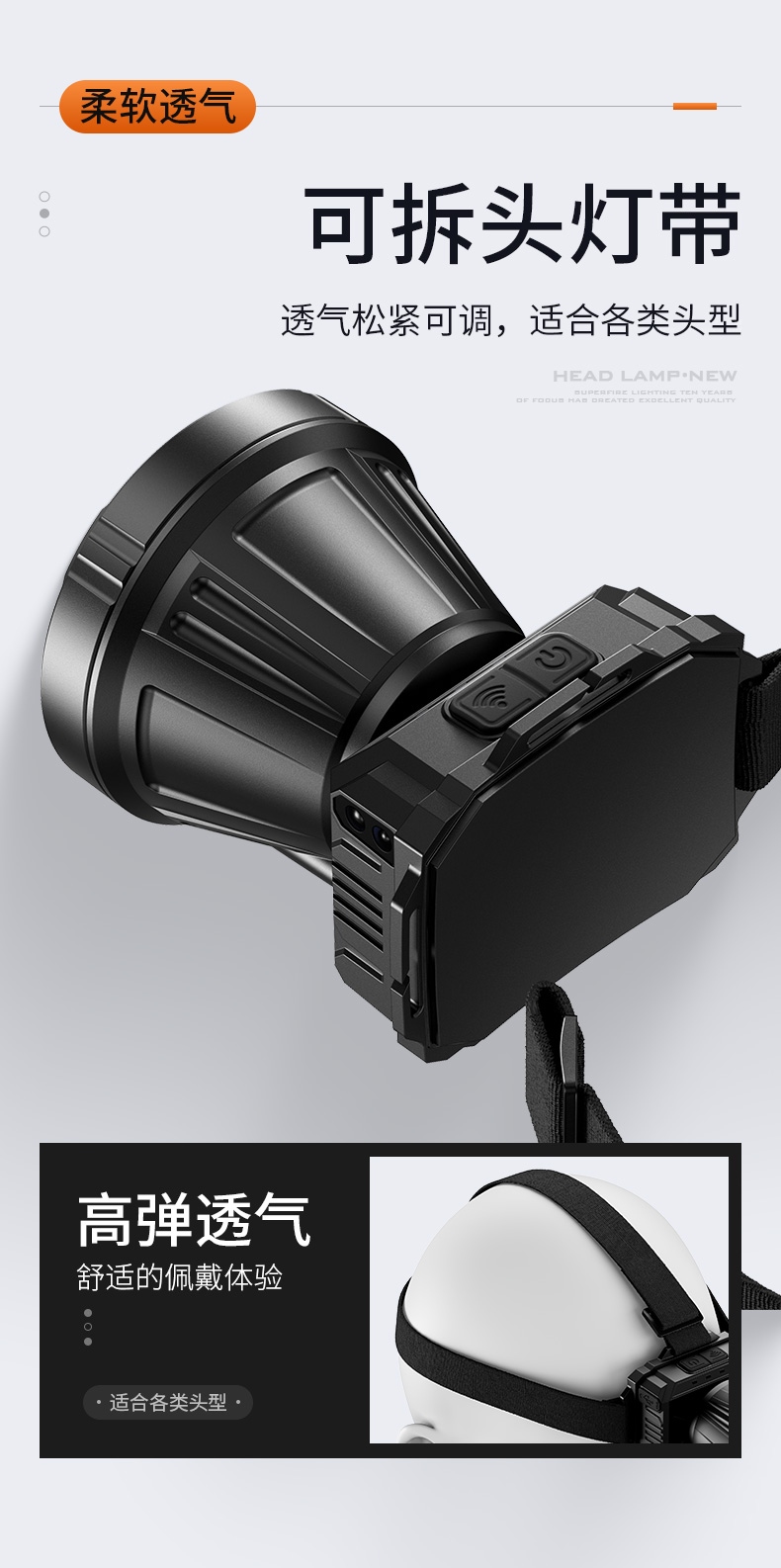 1、五档一体:强中弱、爆闪、SOS自由切换,可满足不同场景下的使用需求。 2、电量显示:实时电显,轻松掌握电量,一目了然。 3、可调节式松紧带:佩戴方便舒适。
