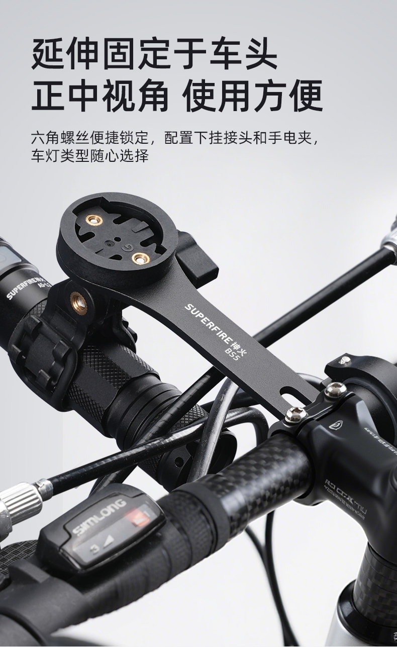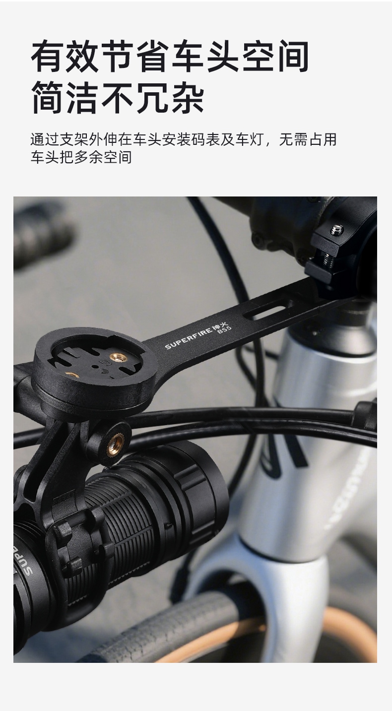 1、通过支架外伸在车头安装码表及车灯,无需占用车头把多余空间;