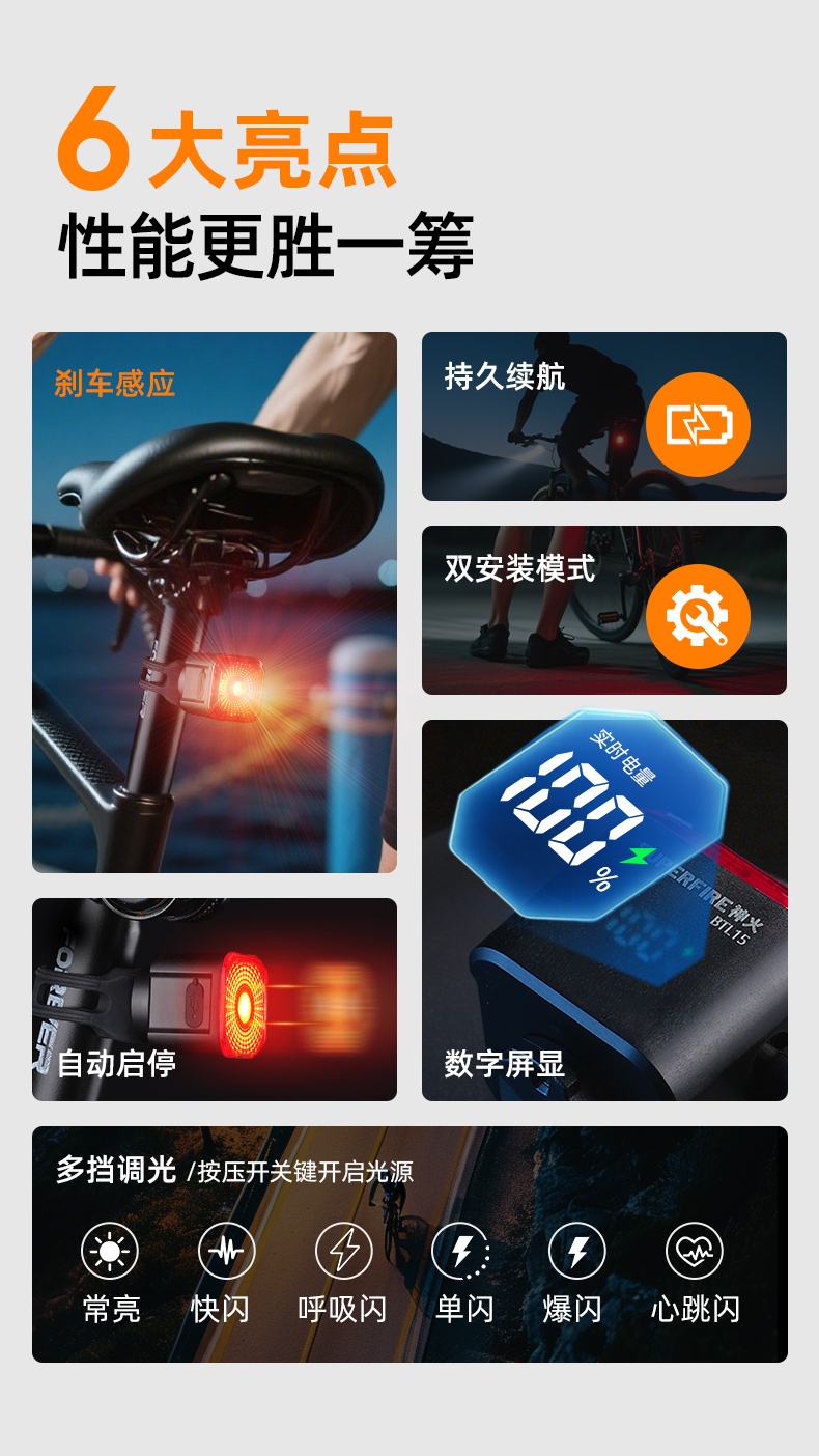1、长按1.5秒开/关机,单击切换挡位:常亮一快闪一呼吸闪一单闪一爆闪-心跳闪; 2、刹车感应:刹车感应会随灯具开启自动启动,灯具关闭是也随之关闭; 3、自动启停:灯具静置40S左右会自动熄灭,检测到运动后自动亮起。