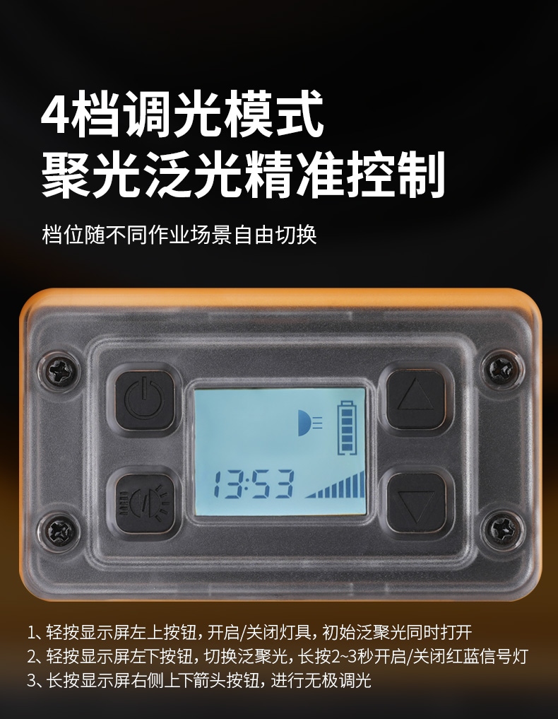 3.2 轻按显示屏左下侧按钮,切换灯具泛聚光照明模式,长按此按键2~3秒开启/关闭信号灯模式;