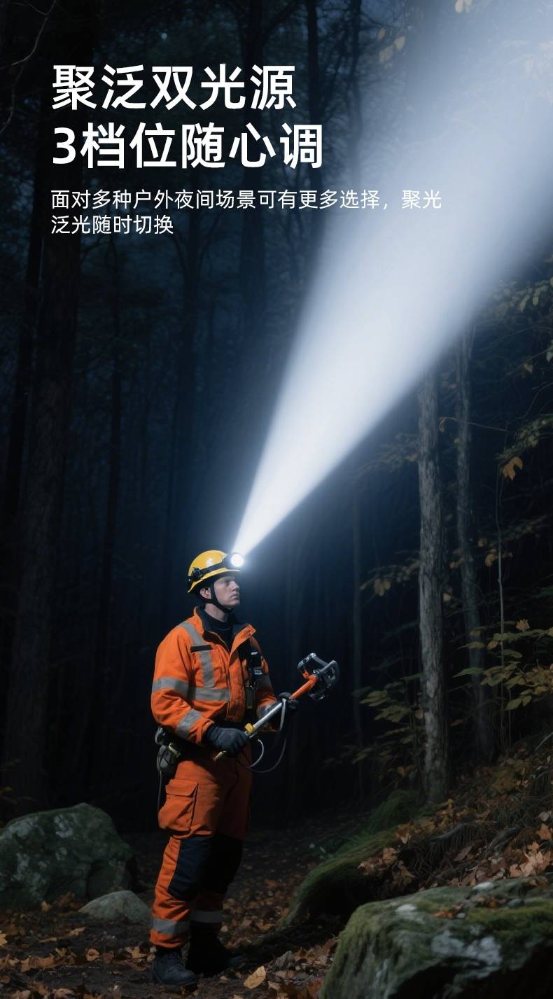 聚光主灯 亮度随心 轻按后端开关按钮,主灯强光点亮,续按依次切换主灯工作光-爆闪光。主灯开启状态下长按5秒,可实现光源色温转换。主灯关闭状态下长按5秒,可开启灯具最亮照明模式。 爆亮强光 亮如白昼 1500LM大功率高亮光源,点亮顷刻如白昼