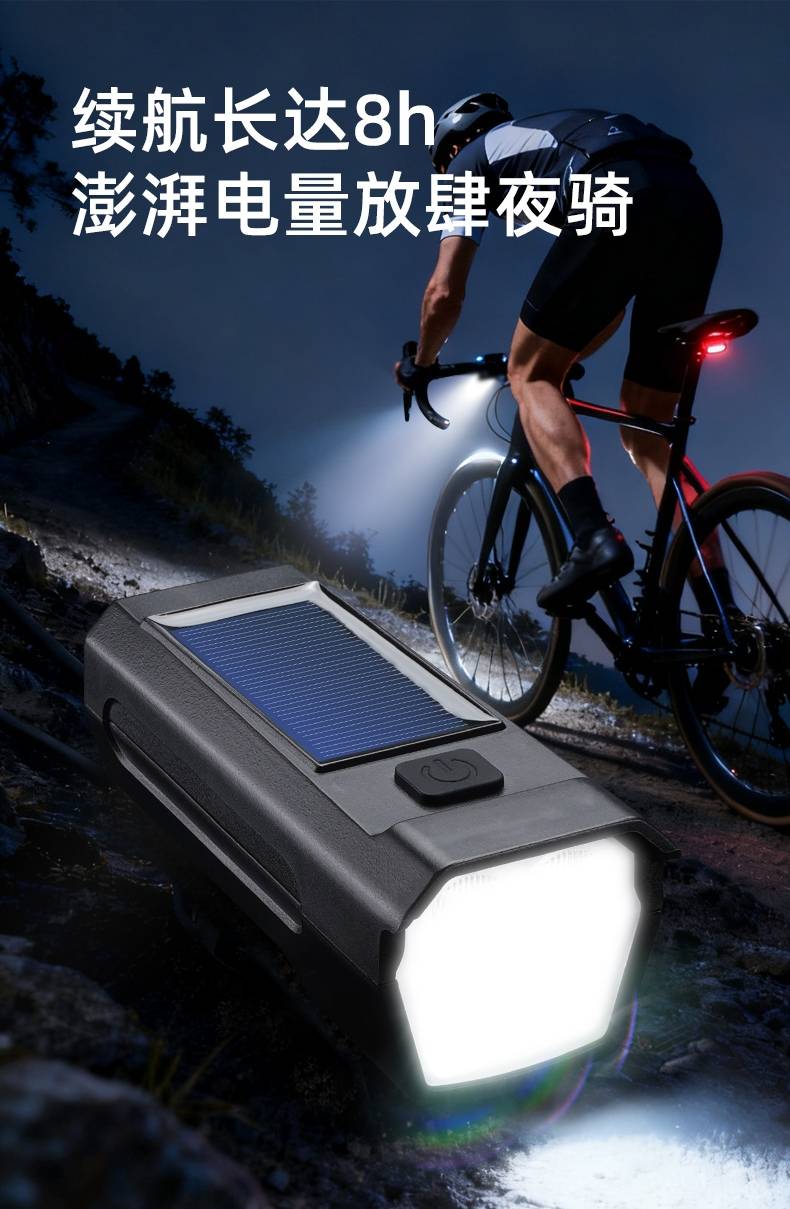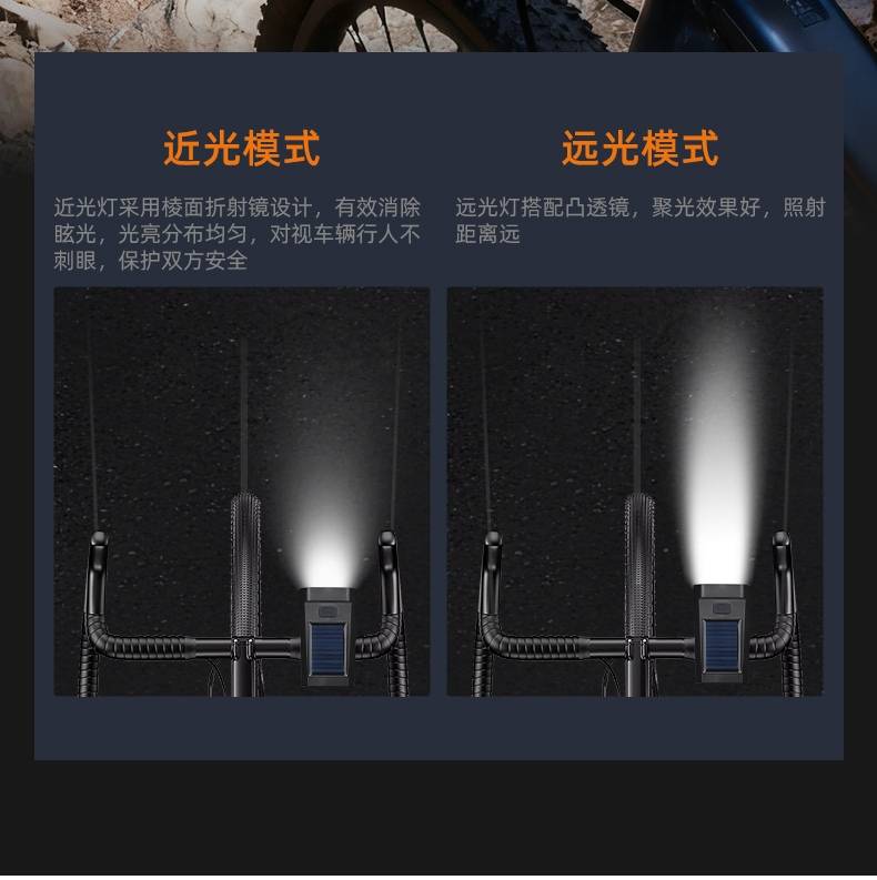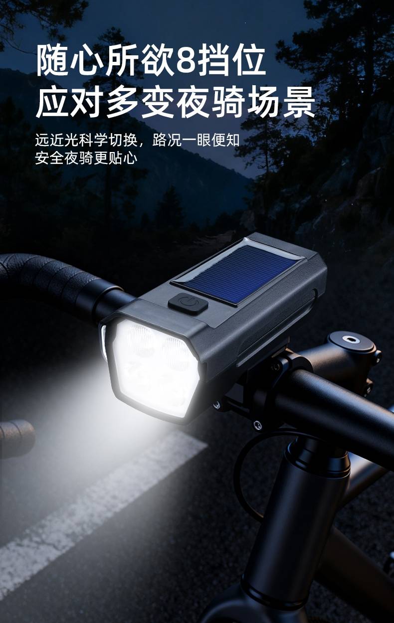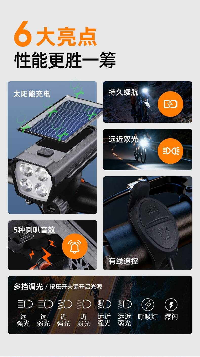 8挡灯光,5种喇叭音效(1米距离可达100分呗),太阳能充电,远近双光,有线遥控.