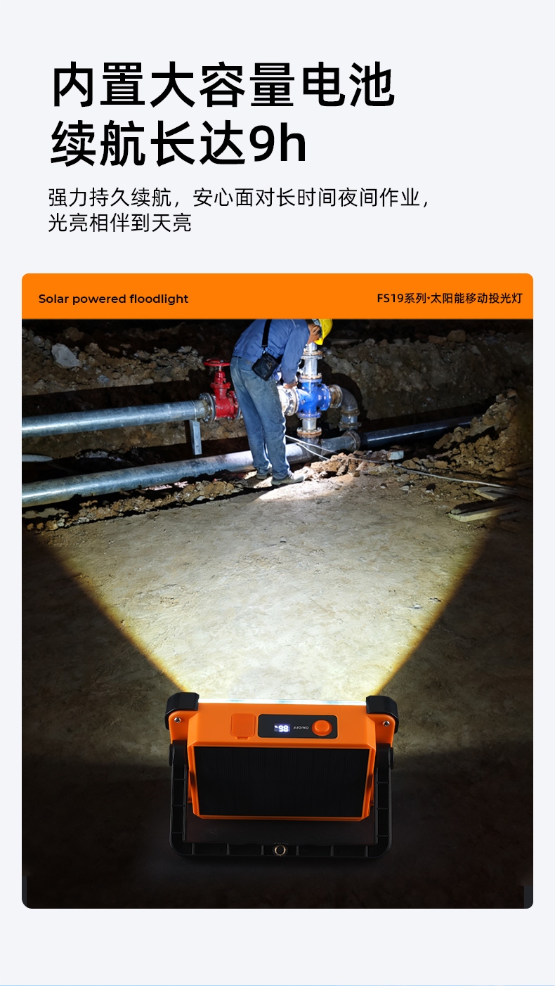 2、灯具配有数字电显屏,可时时了解剩于电量,满电显屏显示100%。