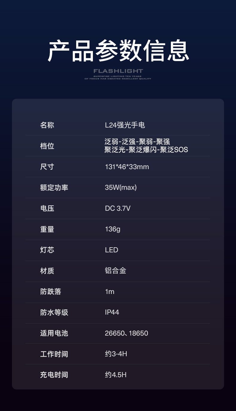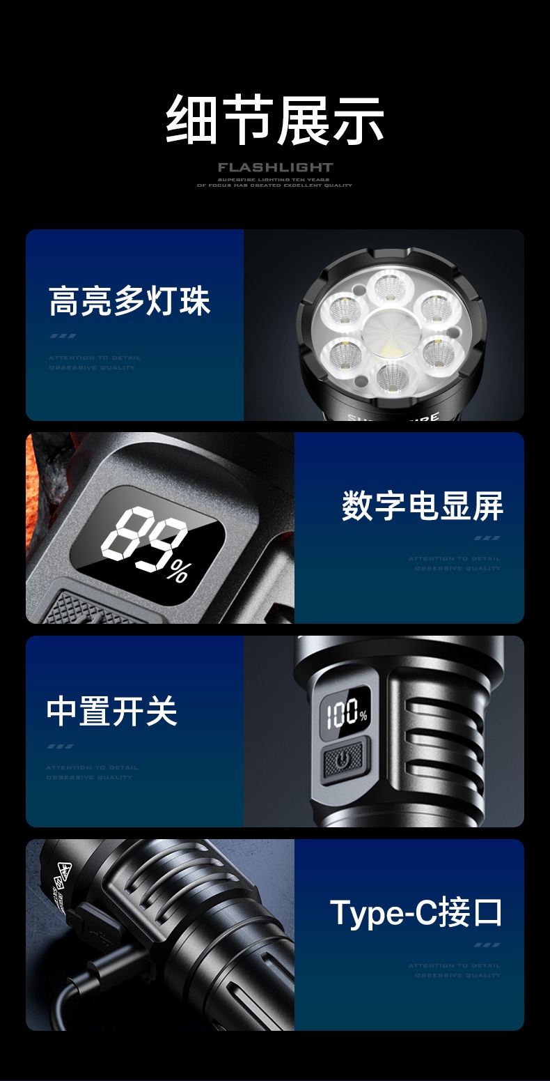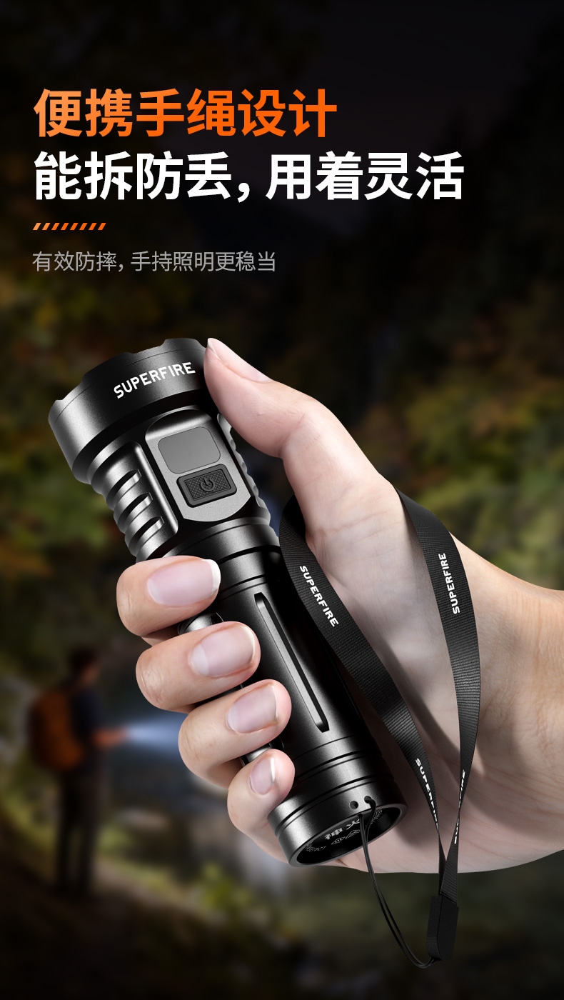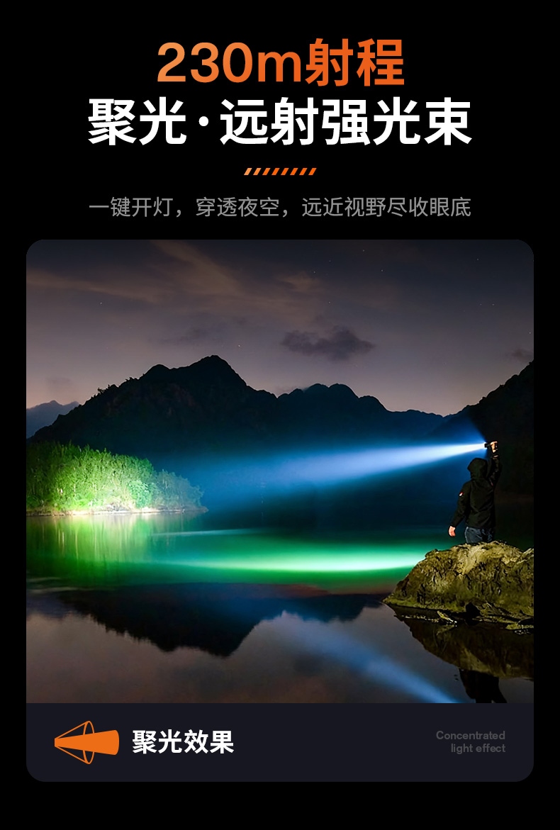1、多颗高亮灯珠,亮度高,照明效果更好。 2、多种安全程序,可有效保护手电使用安全,延长手电使用寿命。 3、聚泛一体,远近兼容。