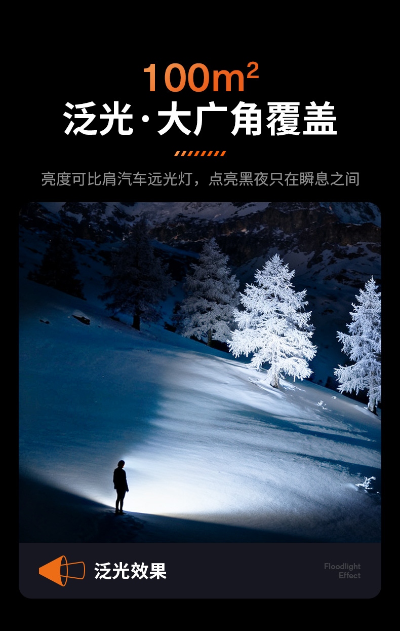 聚光主灯 亮度随心 轻按后端开关按钮,主灯强光点亮,续按依次切换主灯工作光-爆闪光。主灯开启状态下长按5秒,可实现光源色温转换。主灯关闭状态下长按5秒,可开启灯具最亮照明模式。 爆亮强光 亮如白昼 1500LM大功率高亮光源,点亮顷刻如白昼