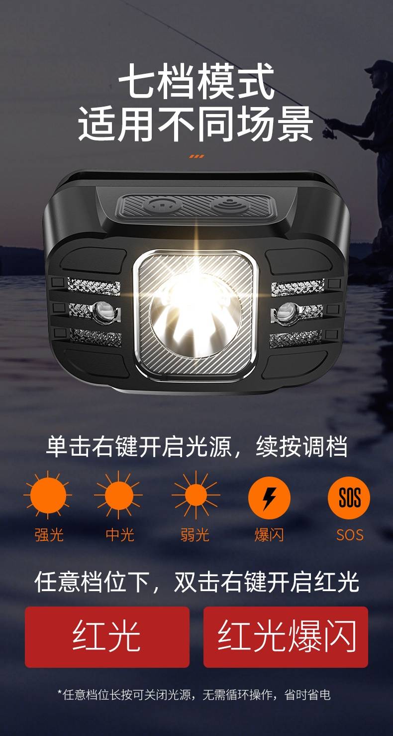 1、单击左边开关开启感应功能,续按关闭感应功能,当感应功能开启时,单击右边开关可正常调节档位。 2、充电时红色指示灯常亮,充满时蓝色指示灯常亮。 3、此款头灯款式潮流、设计小巧、携带方便、头带材质柔软、可自由拆卸、便于清洗。