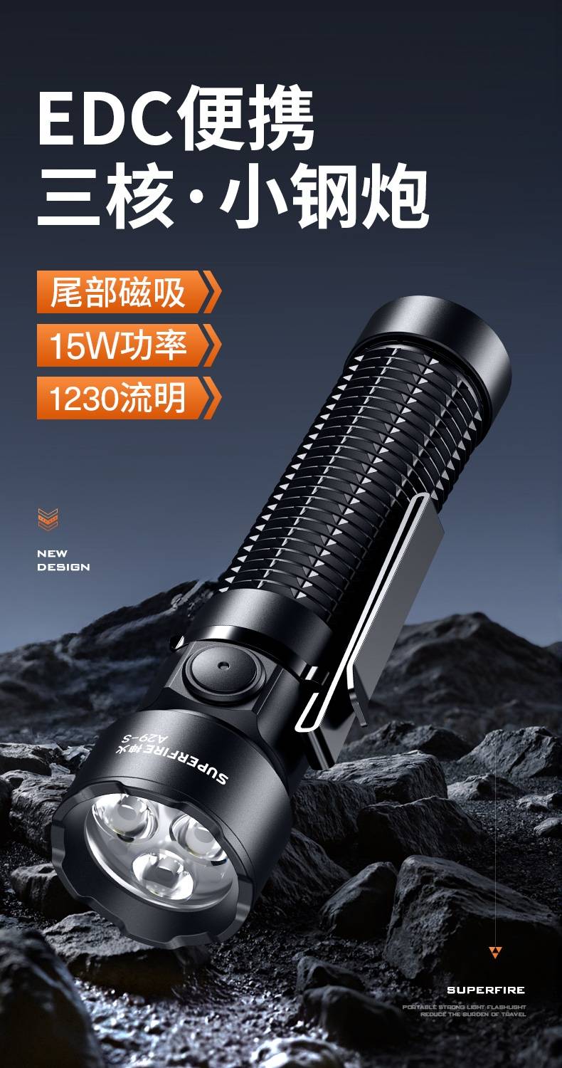 1、多档调光,可满足不同使用场景下的照明需求。 2、多种安全程序,可有效保护手电使用安全,延长手电使用寿命。 3、精致外观,含磁吸、双向腰夹,时尚小巧,方便携带。