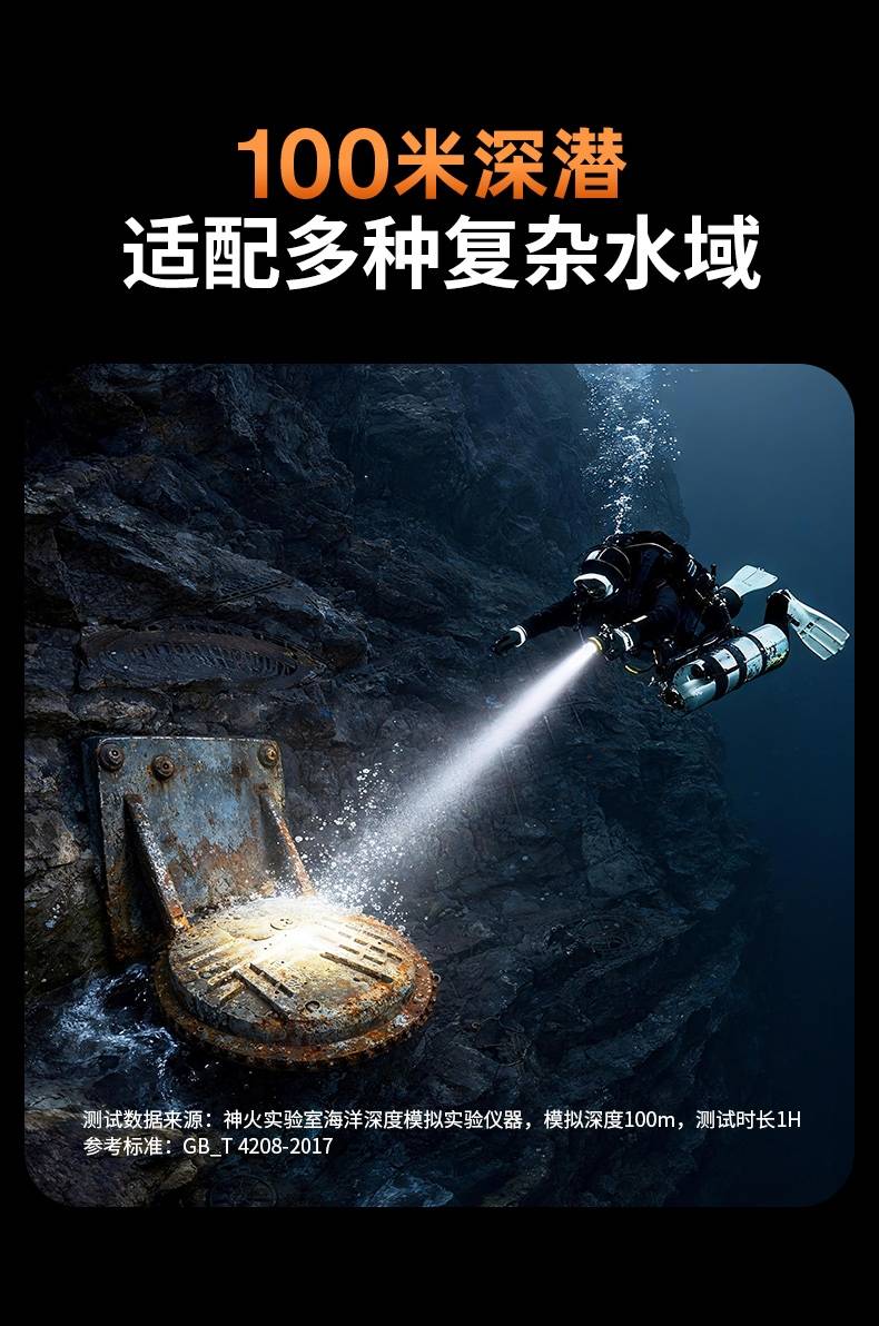 专业级防水设计:经过严格测试,达到IP68标准,能够承受深达100米甚至更深的水压,是深海探索的理想选择。 坚固耐用材料:外壳使用航空级铝合金制造,具备出色的抗冲击和耐腐蚀性能,适合各种恶劣环境下的使用。