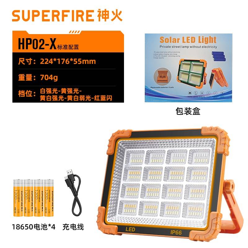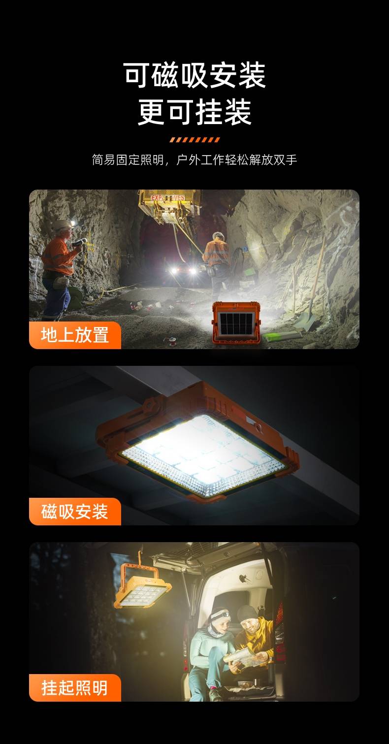 1、多档调光,可满足不同使用场景下的照明需求; 2、含提手,握感更舒适。携带更简单; 3、新型高亮远射灯珠,60W大功率,亮度高,照明效果好。
