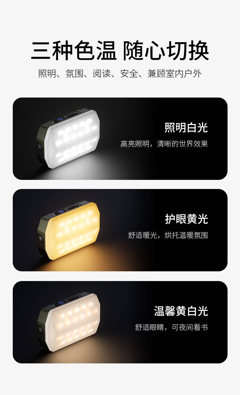 3、多样化充电,使用方便;设有type-c充电接口,可使用充电器、充电宝、电脑等设备为灯具充电。
