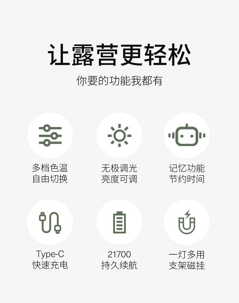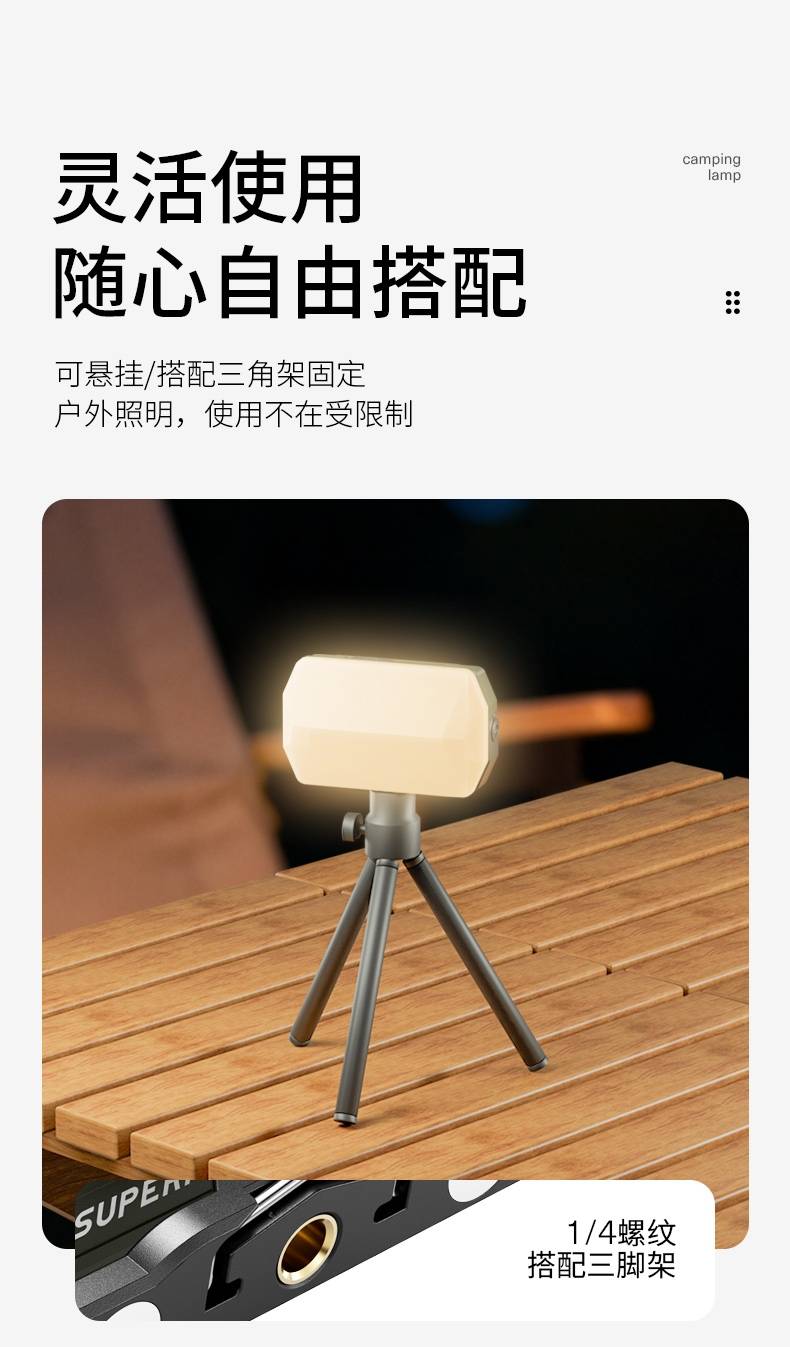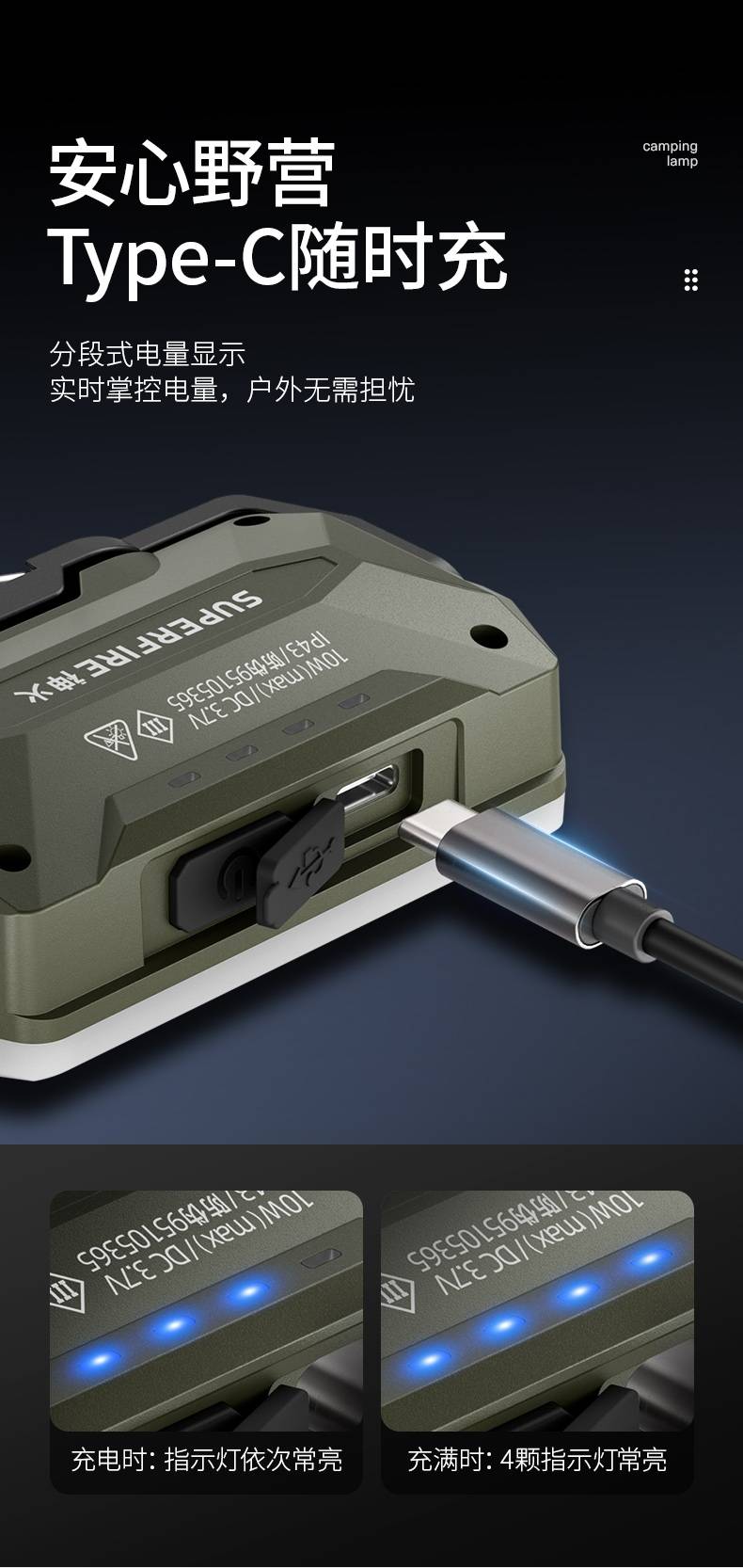 1、充电时一颗蓝色指示灯闪烁 ,依次常亮,充满四颗蓝色指示灯常亮 。 2、多样化充电,使用方便;设有type-c充电接口,可使用充电器、充电宝、电脑等设备为灯具充电。 3、多功能营地灯,此灯带有磁吸、螺母孔、挂钩、支架等功能。
