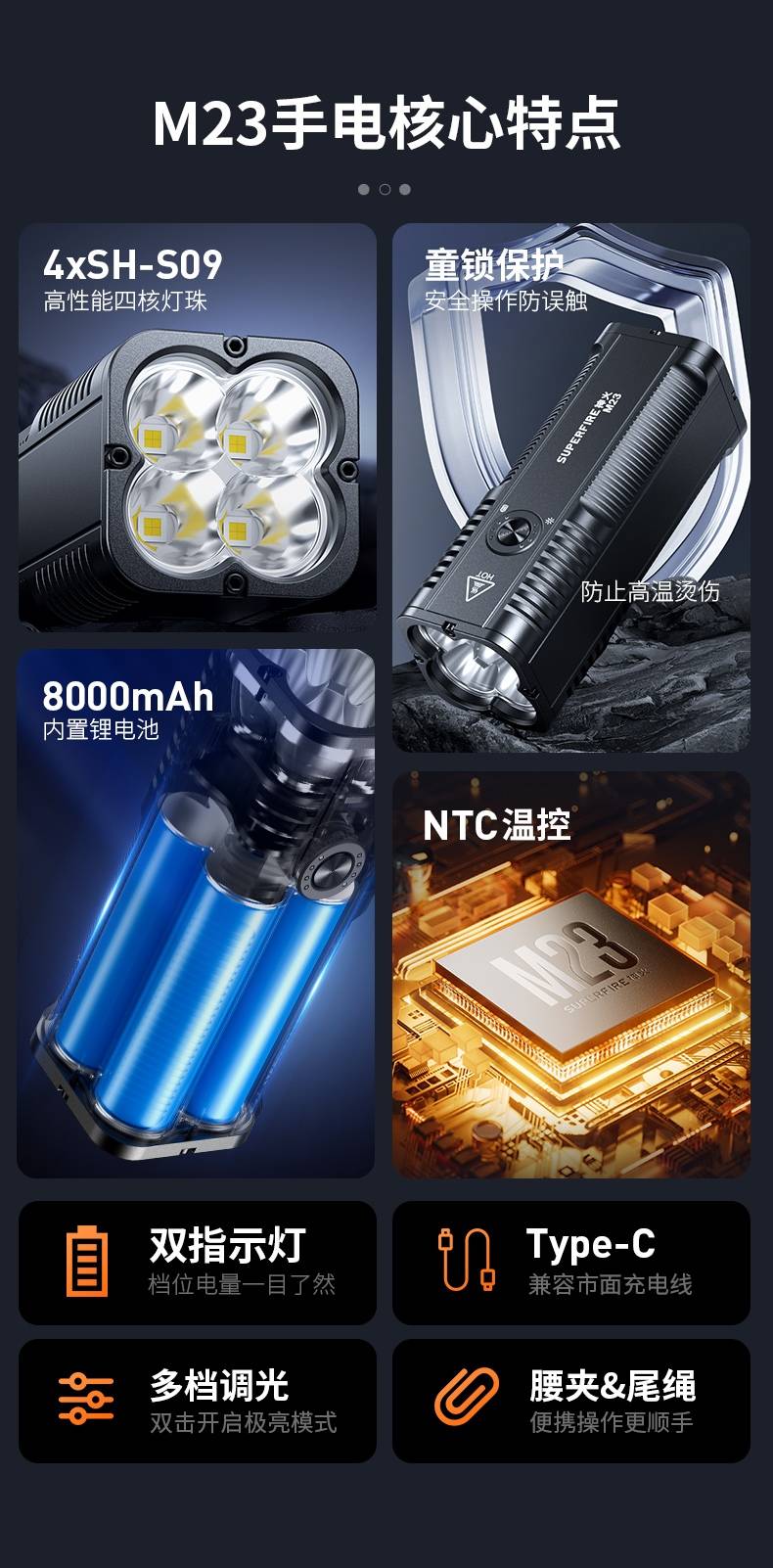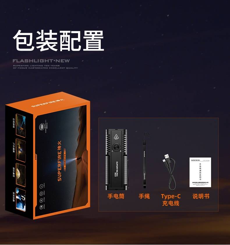 四档调光 Type-C充电 电量显示 铝合金筒身 持久续航 强力防水