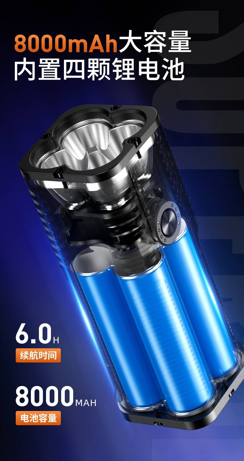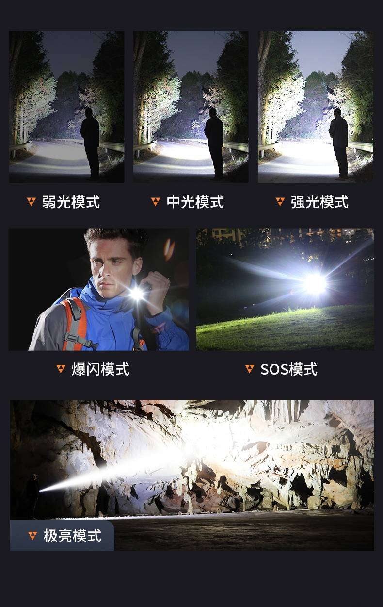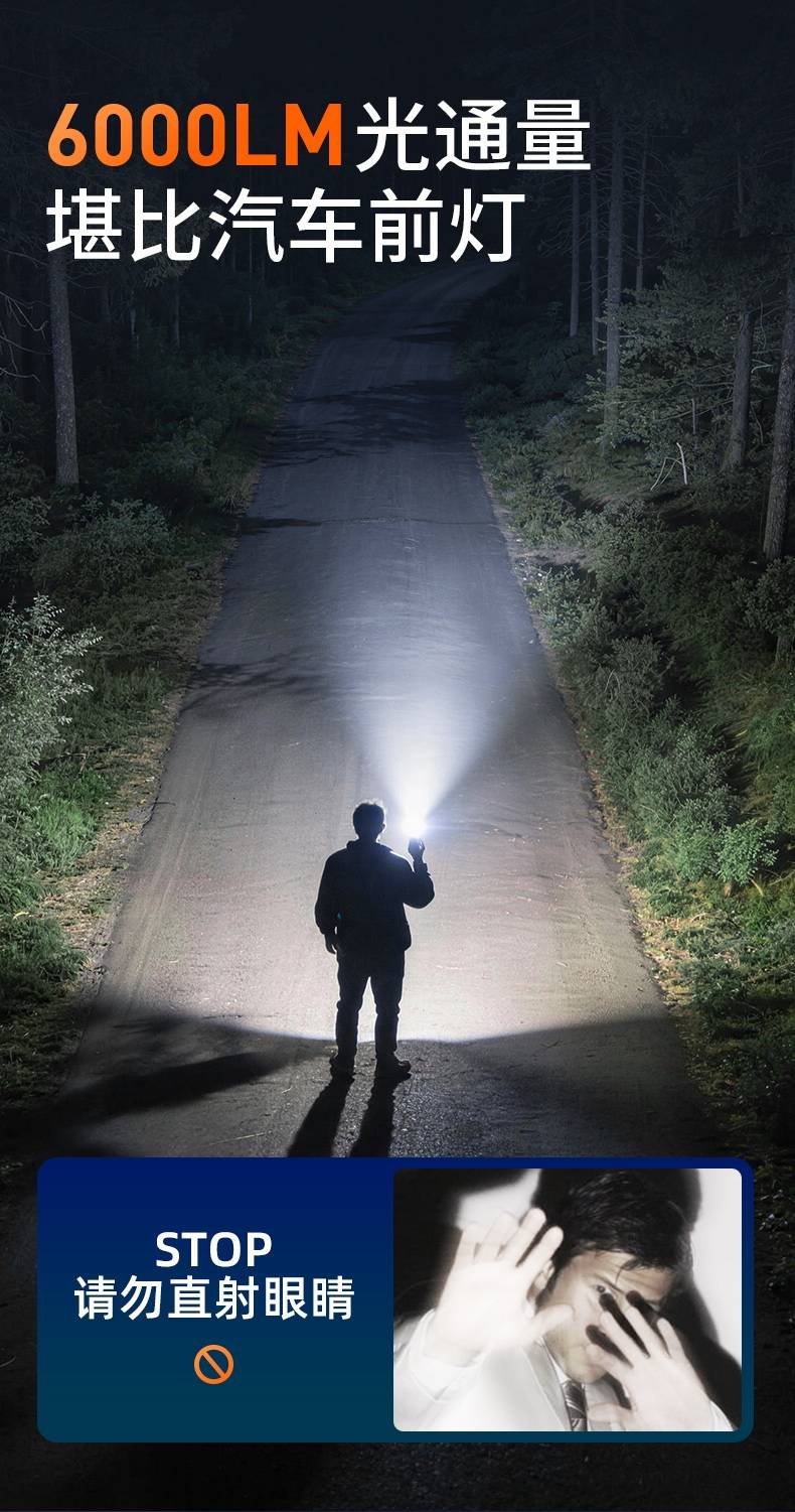 2、最高亮度6000LM,多档照明,满足不同场景的使用要求。