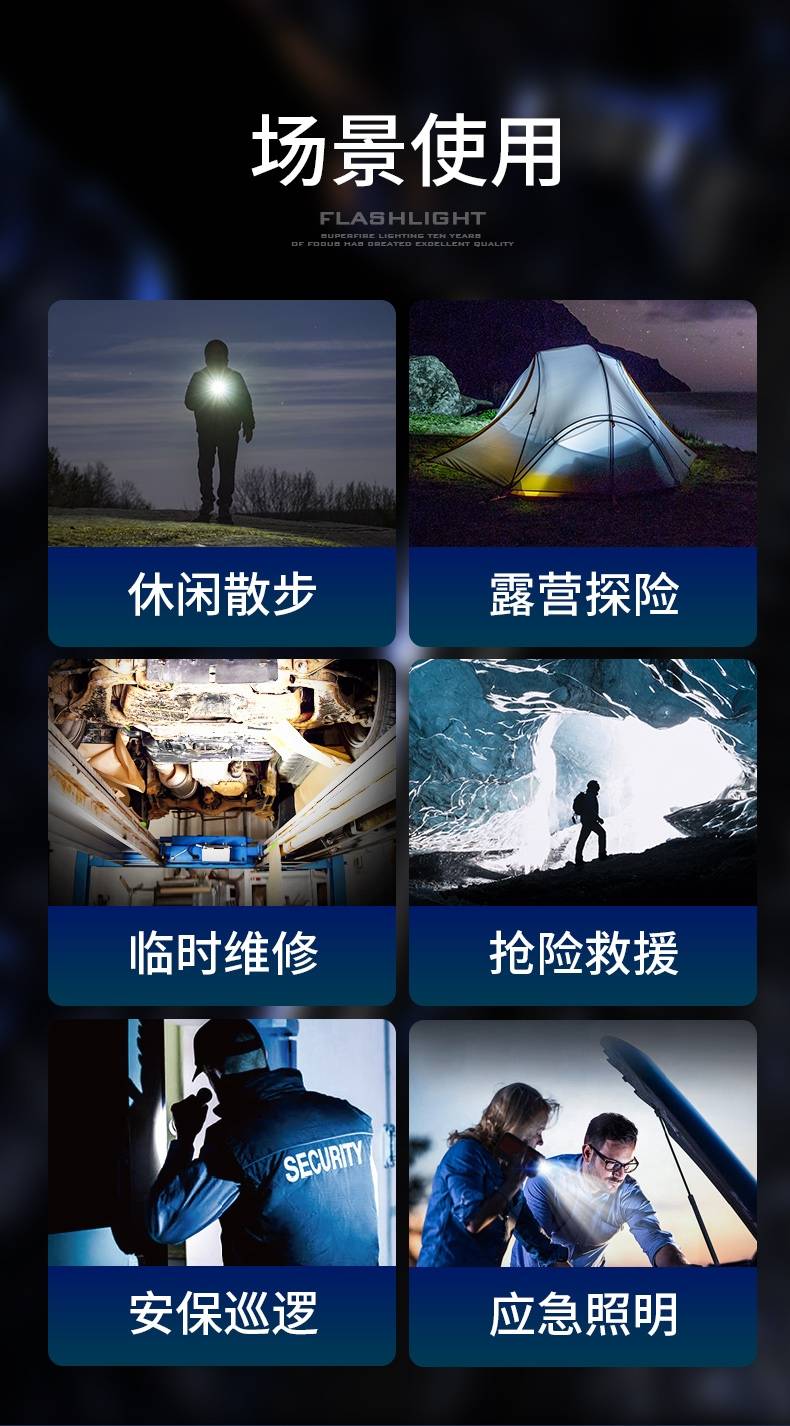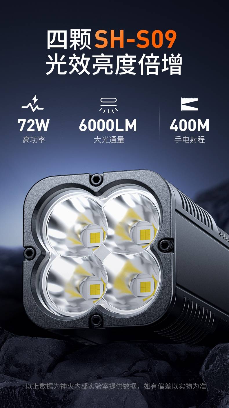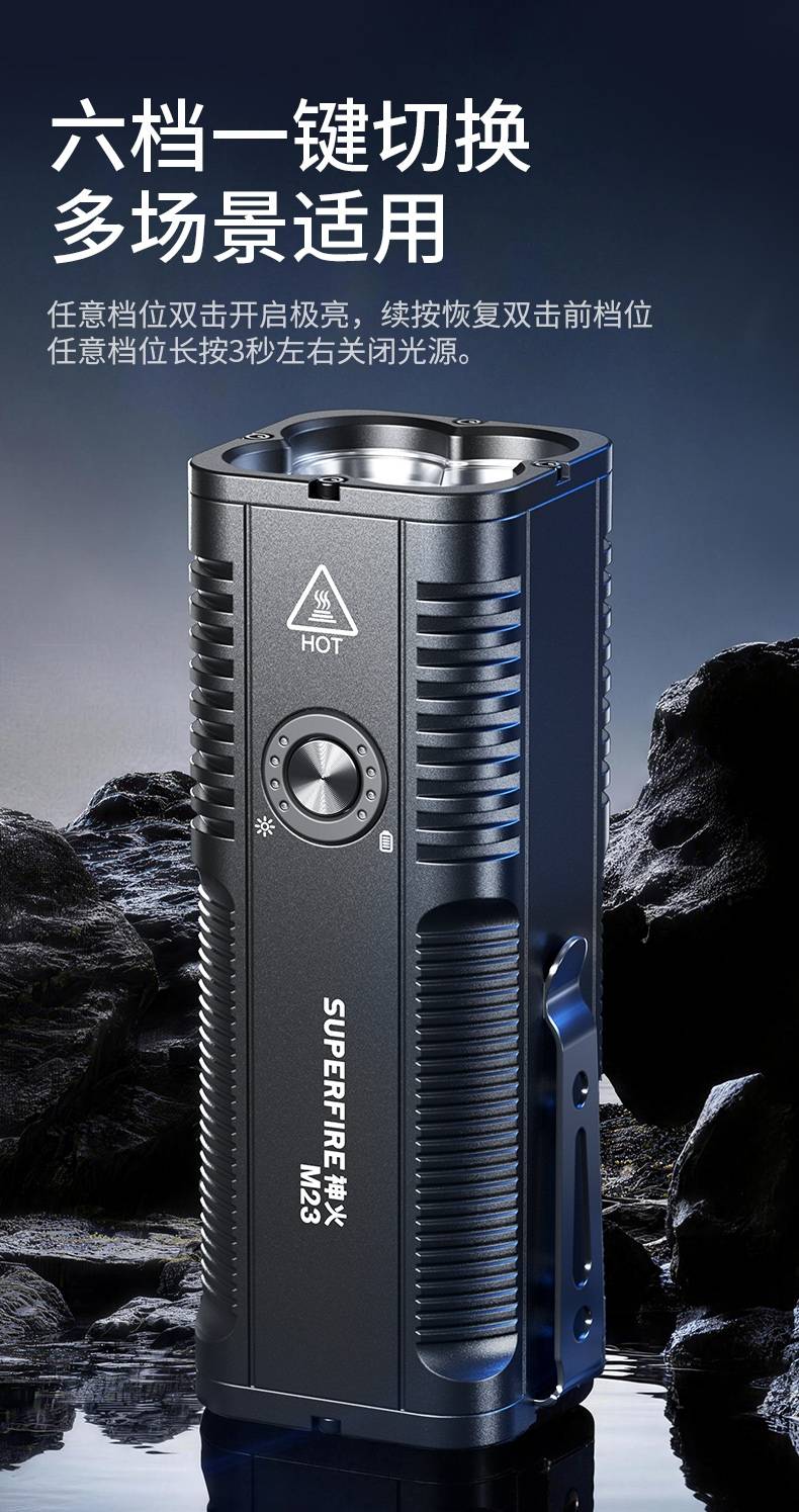 2、最高亮度6000LM,多档照明,满足不同场景的使用要求。