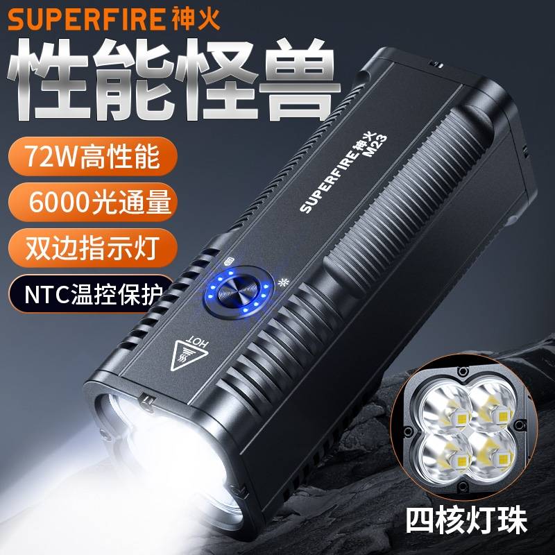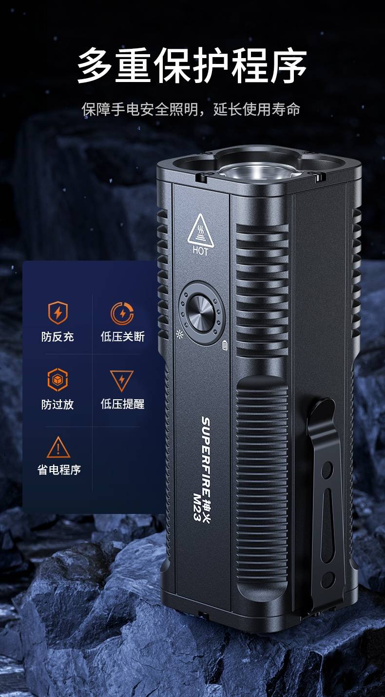 1、千米远射,射程更远,光斑更聚焦。 2、进口灯珠,亮度高,照明效果更好。 3、前后双按键,光源一键点亮,高亮瞬间开启。