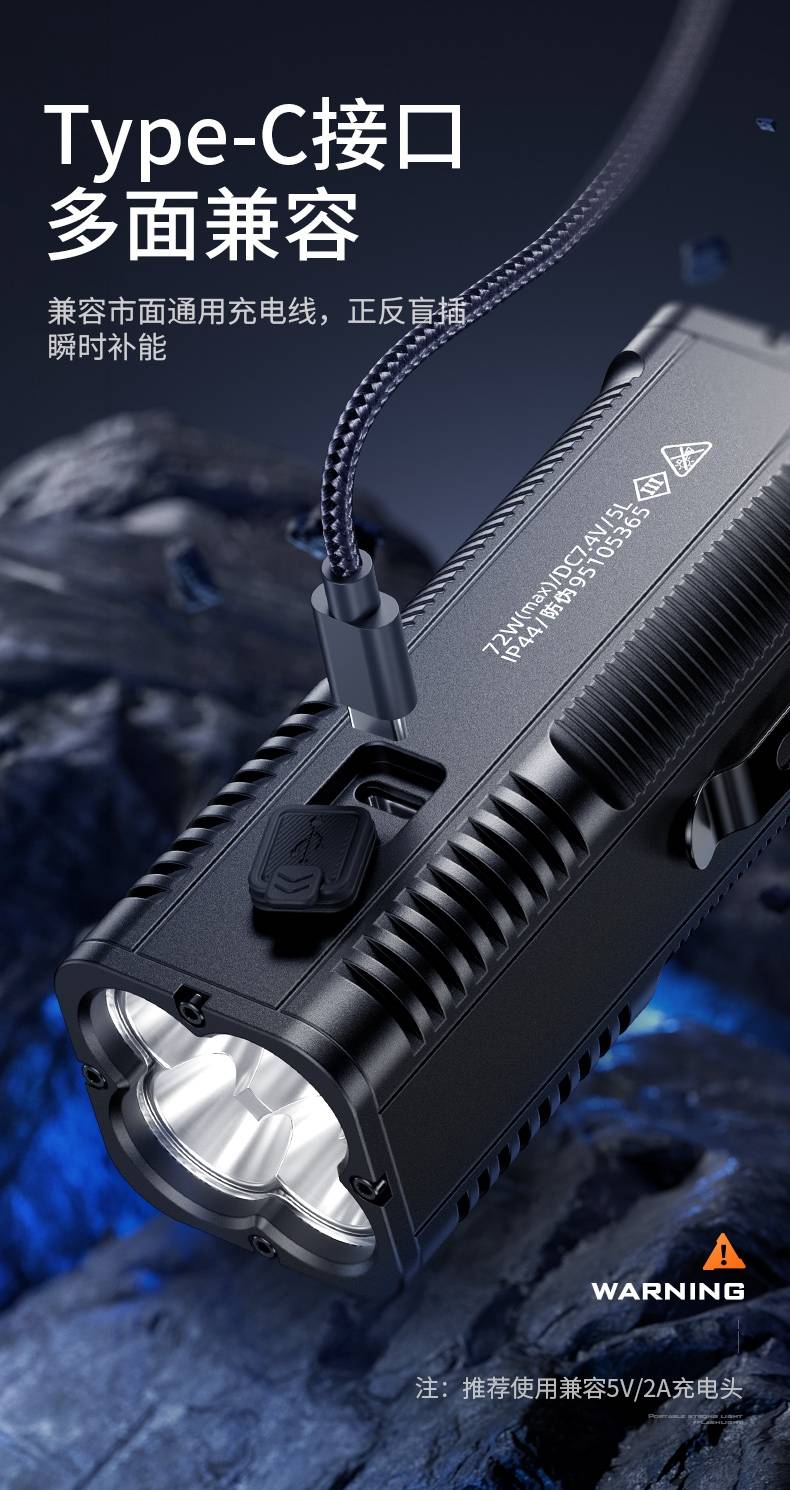 1、6档调光,可满足不同环境下的照明需求。 2、最高亮度6000LM,多档照明,满足不同场景的使用要求。 3、多样化充电,使用方便:设有Type-C充口,兼容市面通用Type-c充电接口。
