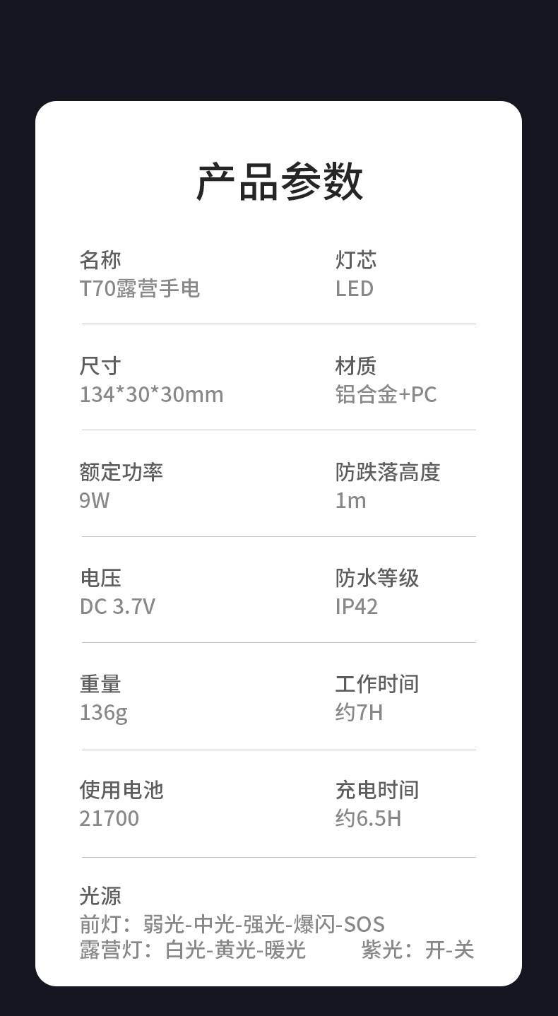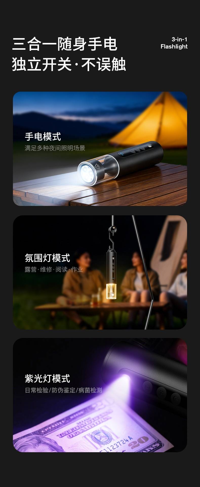 1、前灯+侧灯+紫光、3种照明模式,多档调光,可满足不同使用场景下的照明需求。